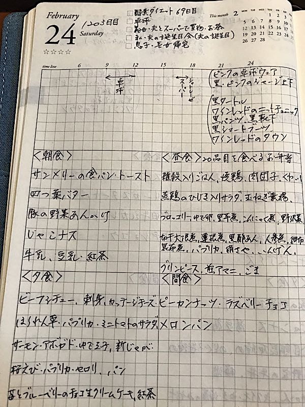ダイエット食事日記1203日目です。 今日は、酵素ダイエット69日目。卓球、義母・夫とスーパーで買物・お茶、私・夫の誕生日会。息子・長女帰宅。卓球には、ピンクの卓球ウェア、黒・ピンクのジャージ上下、黒靴下。帰ってから黒タートル、ワインレッドのニットチュニック、黒パンツ、黒靴下、黒ショートブーツ、ワインレッドのダウン。朝食は、サンメリーの食パン、四つ葉バター。豚の野菜あんかけ。じゃこ茄子。豆乳・紅茶、牛乳。卓球の練習に行き、ダブルスの試合などしました。昼食は、20品目の食材を食べるお弁当。雑穀入りご飯、焼鶏、肉団子、くわいと蒸鶏のひじき入りサラダ、玉葱素揚、ブロッコリー、茹玉子、里芋煮、蒟蒻煮、調味野沢菜、切干大根煮、蓮根煮、黒酢あん、人参煮、細切昆布の煮物、パプリカ、絹さや、いんげん、グリンピース、煎アマニ、胡麻。夫は筍炊き込みごはん弁当。息子が河口湖旅行から帰ってきたので、バレンタインのチョコをあげました。ピーカンナッツチョコとピーカンナッツ・ラズベリーチョコ。ピーカンナッツ・ラズベリーチョコは一粒貰いましたが、甘酢っぱくて美味しい。安田牛乳ブラウニーもあげたら、胡桃は要らないというので、上を切りました。息子は食べたら、友達とサッカーしに行きました。義母・夫とスーパーで買物した後、パン屋で買ったパンをイートインで食べました。私はメロンパン、義母はアンパン、夫は照り玉マヨパン。今日は夫の誕生日で、20日が私の誕生日だったので、今日まとめて誕生日会。菓子工房Mielでバースデーケーキを買おうとしたら、これから作ると7時になると言われ止めました。シャトレーゼに行き、苺とブルーベリーのチョコ生クリームデコレーションにしました。シリアルなども入ってる。チョコのプレートに名前も書いてもらいました。息子もいったん帰ってきたけど、また友達と喜楽里温泉に行って、そのまま自宅に帰ると言う。これから誕生日会なのに淋しいですね・・・夕食は、長女マッキーが作ってくれました。ビーフシチュー、刺身、カッテージチーズ・ほうれんそう・パプリカ・ミニトマトのサラダ、サーモン・アボガド・茹で卵、新じゃが・桜エビ・パプリカ・セロリのサラダ。生チョコケーキ、紅茶。ビーフシチュー。義母には、牛肉を小さく切りました。パン。長女マッキーの友達のTちゃんが焼いてくれたそう。トーストしたのはうちだけど。苺とブルーベリーのチョコ生クリームデコレーションケーキ。ろうそくを1本だけ立て、「ハッピーバースデー」を歌ってから、ろうそくの火を一緒に吹き消しました。2人で。長女、義母、夫と私。レモンティーで。クリームは思ったよりあっさりしてるけど、ボリュームはある。年取るのは嫌だけど、祝ってもらうのはやはりいいですね。長女も明日は朝早く、前の勤務先のカフェスローのイベントに行って、そのまま帰るそうです。 あすけん食事日記。 アドバイス。