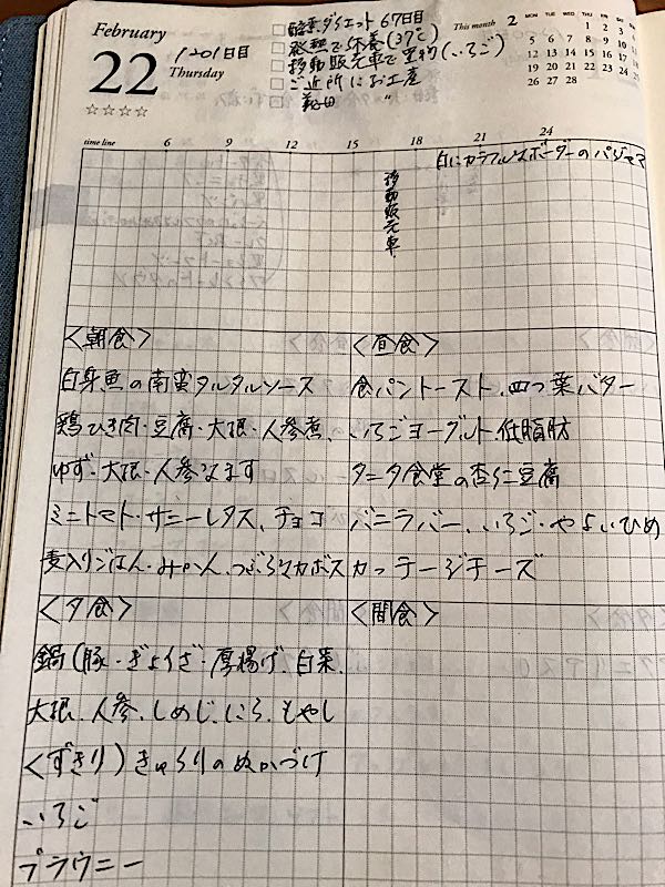 ダイエット食事日記1201日目です。 今日は、酵素ダイエット67日目。発熱で休養。移動販売車で買物、ご近所・義母にお土産。 白にカラフルなボーダーのパジャマ。 昨夜38.1℃出たけど、今朝は37℃くらいだったので、病院に行くのはやめて、うちで休養。 朝食は、白身魚の南蛮タルタルソース、鶏ひき肉・豆腐・大根・人参煮、柚子・大根・人参なます、ミニトマト・サニーレタス。麦入りご飯。みかん。 つぶらなカボス。 神戸ショコラ・ミルクチョコ。 食パンのトースト、四つ葉バター。 いちごヨーグルト・低脂肪。 タニタ食堂の杏仁豆腐。 バニラバー。 移動販売車で買ったいちご・やよいひめ。 ご近所のTさんも買いに来てたので、スキー旅行のお土産を渡しました。 カッテージチーズ。 夕食は、鍋。豚、餃子、厚揚げ、白菜、大根、人参、しめじ、もやし、ニラ、葛きり、胡瓜の糠漬け。いちご、ブラウニー。 豚、白菜、人参、大根、しめじ、厚揚げ。 もやし、にら、餃子。 葛きり。 胡瓜の糠漬け。 いちご・やよいひめ。 義母に新潟土産の安田牛乳ブラウニー。 夫のお弁当は、鍋の豚・もやし・にら・しめじ、胡瓜の糠漬け、アジフライ、ひじき煮。 紫蘇にんにく、南高梅の梅干し、胡麻昆布、麦入りご飯、胡麻、海苔。 あすけん食事日記。 アドバイス。