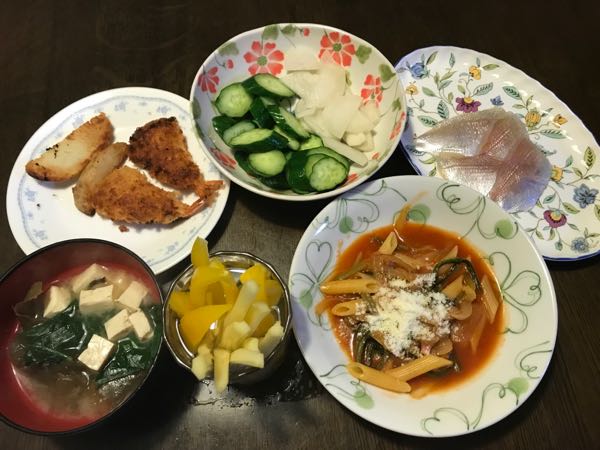 夕食は、エビフライ、フライドポテト、小鯛の笹締め、ウィンナー・ペンネ・玉葱・ほうれん草・粉チーズのミネストローネ、胡瓜・大根の糠漬け、セロリ・パプリカのスティックサラダ、豆腐・わかめ・ほうれん草の味噌汁。エビフライ、フライドポテト。小鯛の笹締め。胡瓜・大根の糠漬け。豆腐・わかめ・ほうれん草の味噌汁。セロリ・パプリカのスティックサラダ。ガーリックマヨネーズで。夫のお弁当は、エビフライ、フライドポテト、小鯛の笹締め、ウィンナー・ペンネ・玉葱・ほうれん草・粉チーズのミネストローネ、胡瓜・大根の糠漬け。紫蘇にんにく、南高梅の梅干し、胡麻昆布、麦ごはん、胡麻、海苔。あすけん食事日記。アドバイス。
