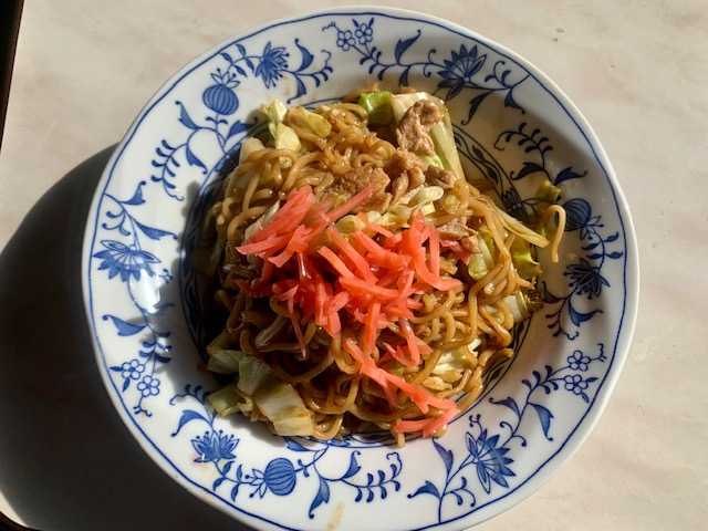 昼食は、醤油ラーメン・ニラ・もやし・ネギ、卵炒飯。