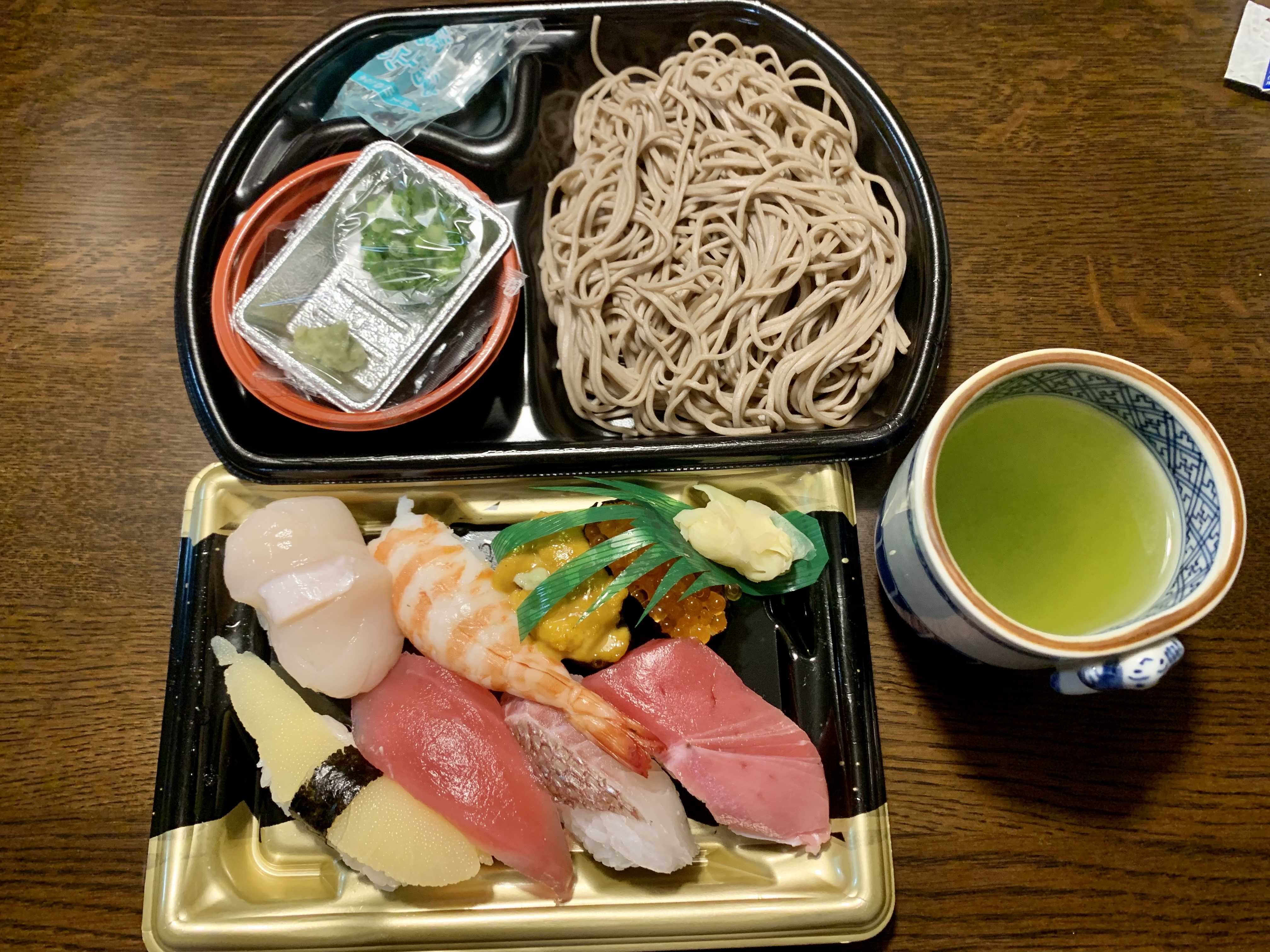 夕食は、握りずし・もりそばのセットを配達してもらいました。緑茶と。夫の分。