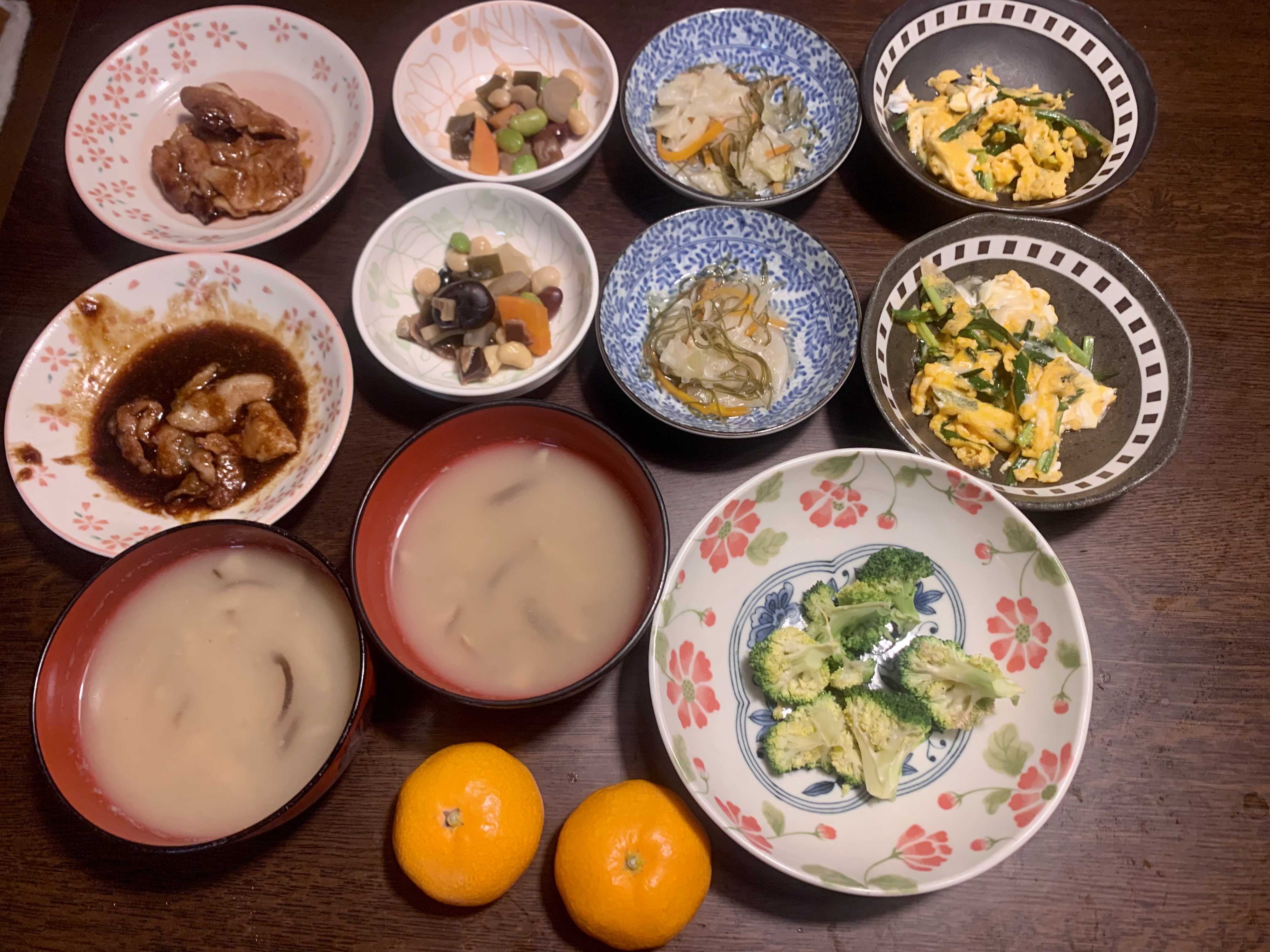 朝食は、テリーヌ、ハムエッグ、スナックサンド、麦ご飯、鍋、べったら漬け、酢だこ、しめさば、かにの味噌汁。長女は今日帰宅するけど、おせちを買ってないから、1日早くおせちを食べたいというので出しましたw黒豆、栗きんとん、田作り、昆布巻き、伊達巻、なます、数の子、酢だこ、ちょろぎ。テリーヌも。