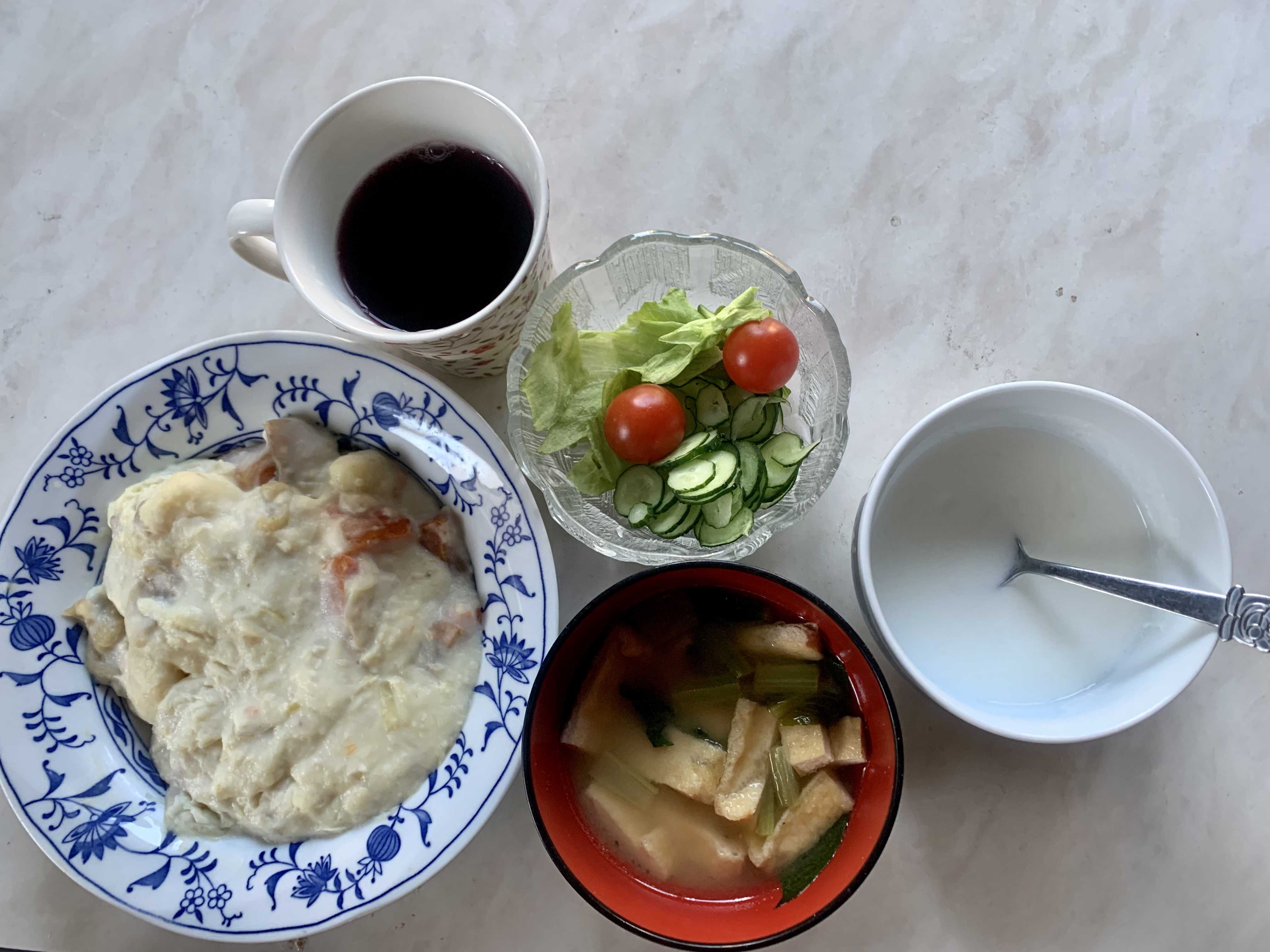 朝食は、チキンクリームシチュー、レタス・胡瓜・ミニトマト、油揚げ・小松菜の味噌汁、カスピ海ヨーグルト、グレープジュース。