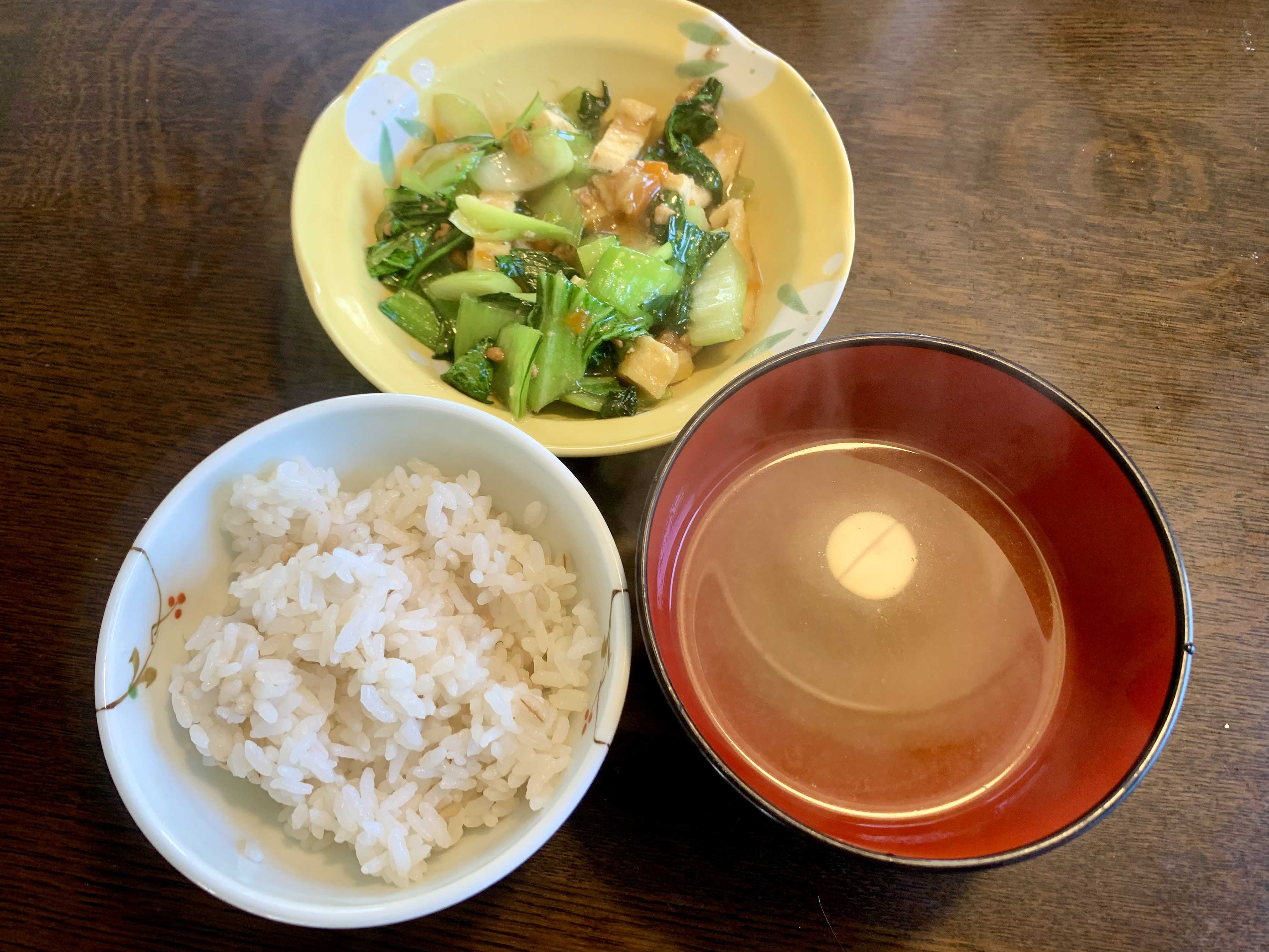 昼食は、油揚げ・青梗菜のそぼろ炒め、味噌汁、麦ご飯。