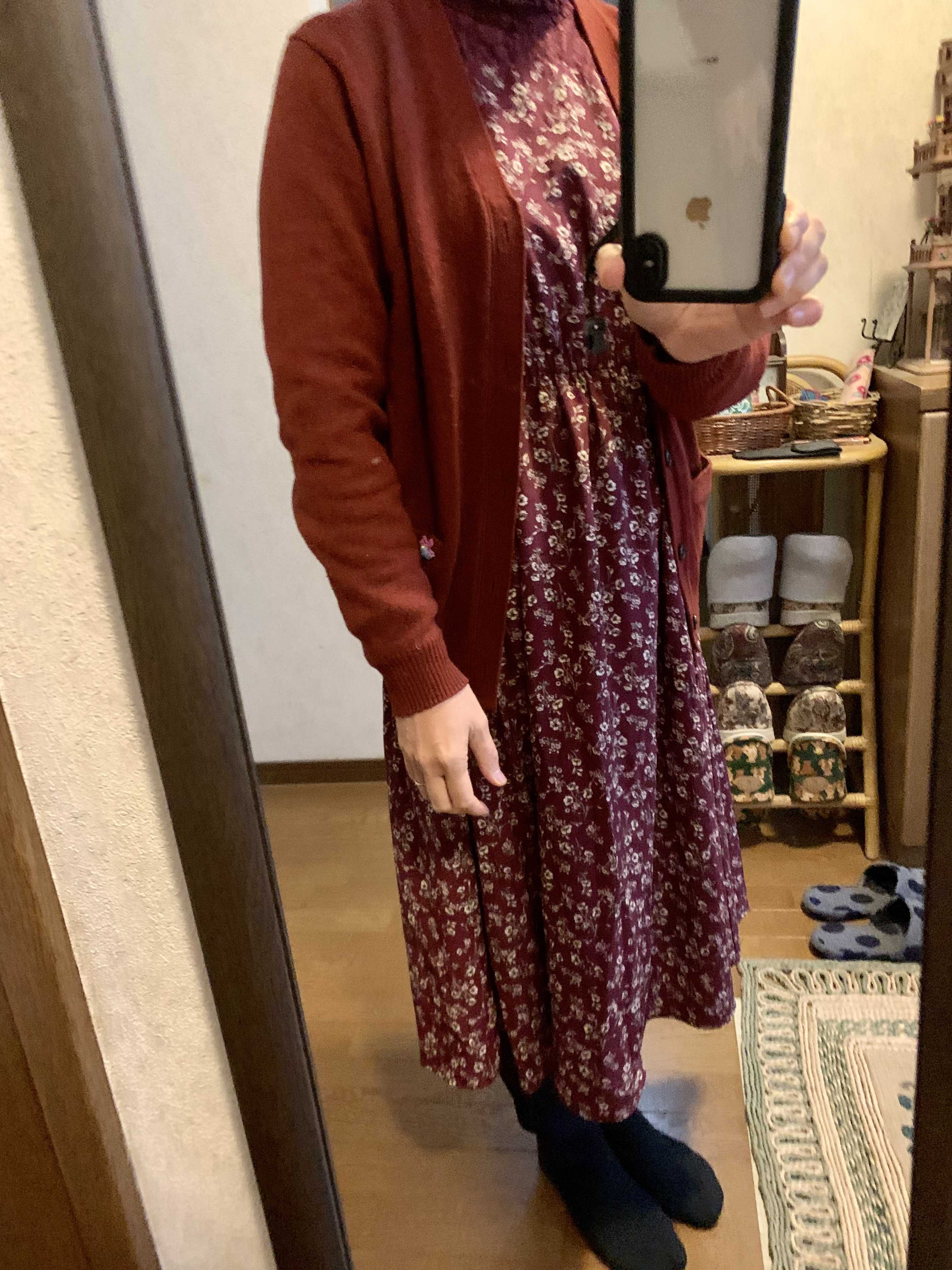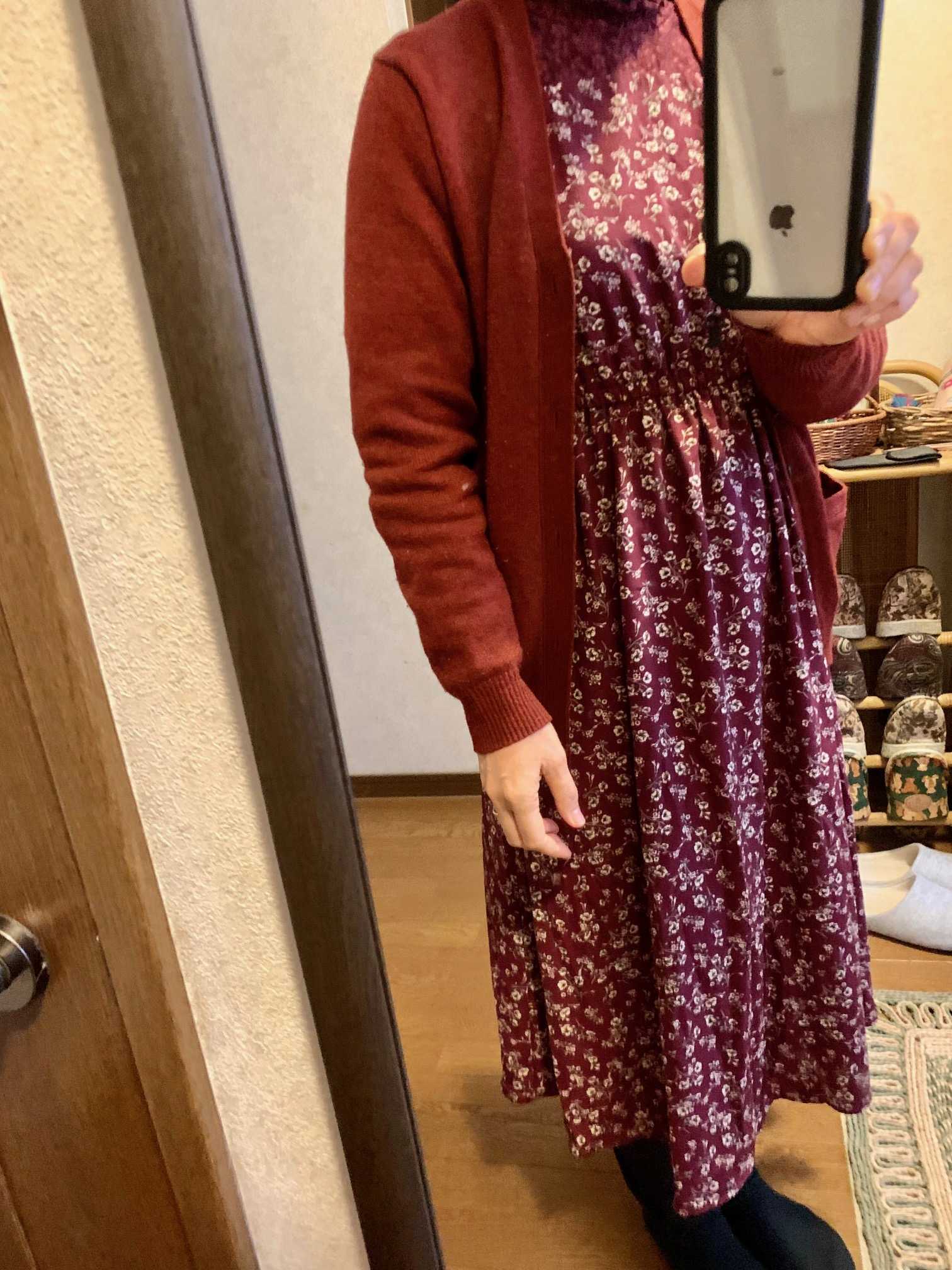 ダイエット食事日記5491日目、片付け、整形外科。黒タートル、黒・グレー・赤のワンピース、カラフルなカーディガン、黒パンツ、黒靴下、紺ブーツ。臙脂のライトダウン。