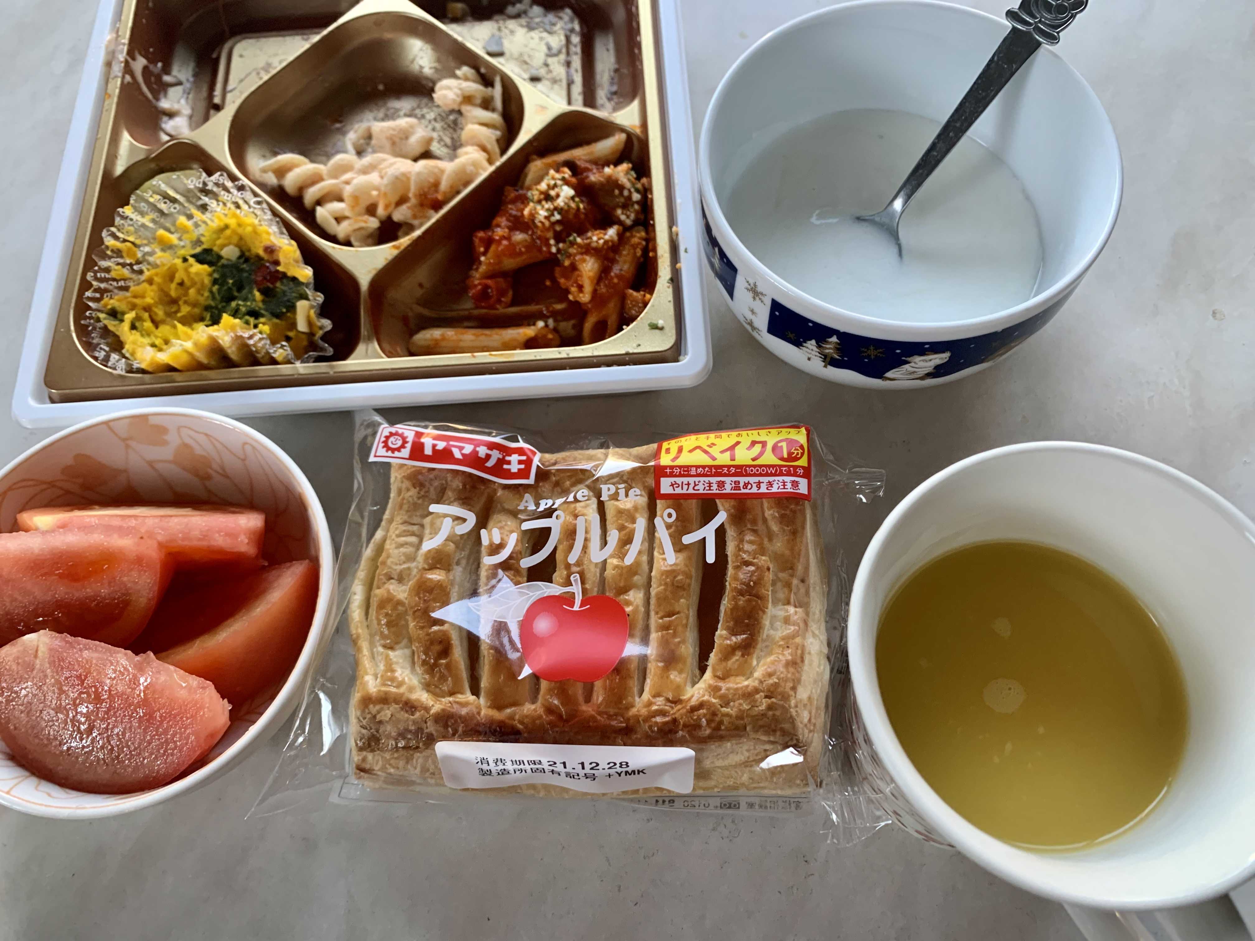 朝食は、マカロニサラダ、南瓜サラダ、アップルパイ、トマト、カスピ海ヨーグルト、オレンジジュース。