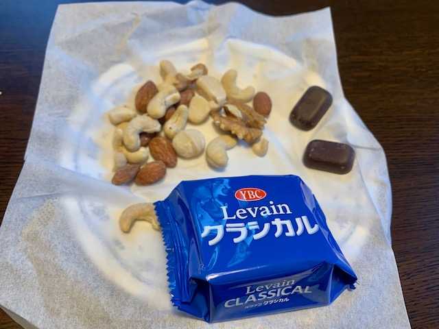 おやつは、ミックスナッツ、チョコ、クラッカー、緑茶。