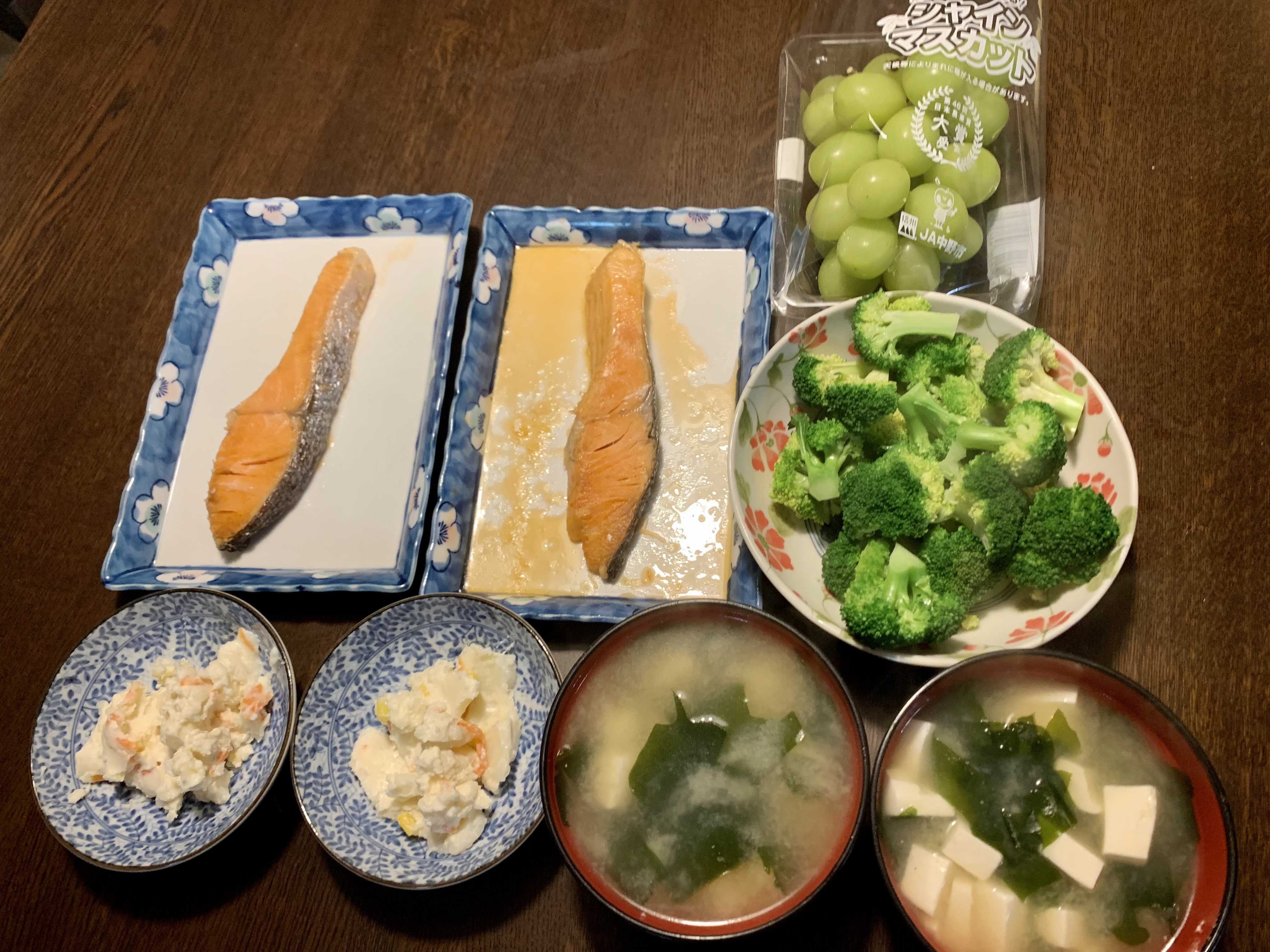 夕食は、焼き鮭、ポテトサラダ、蒸しブロッコリー、豆腐・わかめの味噌汁、シャインマスカット。体重は、夕食後・入浴前59.5kg。2日前より1.1㎏増えてしまった・・・体脂肪率は、36.5%。入浴後、59.2kg。33.8%。