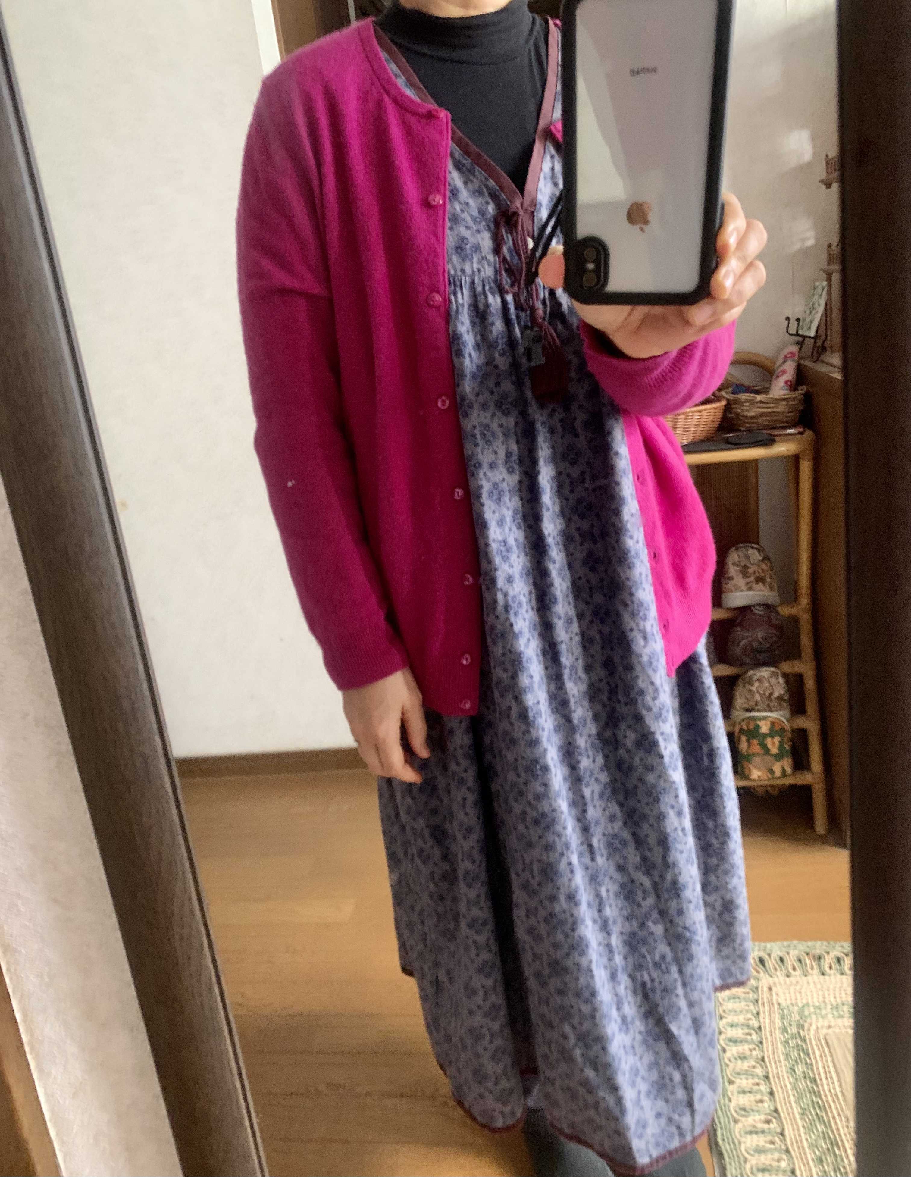 ダイエット食事日記5493日、スーパー・ベルク、正月飾り、息子・次女家族・長女が帰省。黒タートル、グレー・青・茶のワンピース、マゼンカのカーディガン、黒パンツ、黒靴下、紺ブーツ。臙脂のライトダウン。