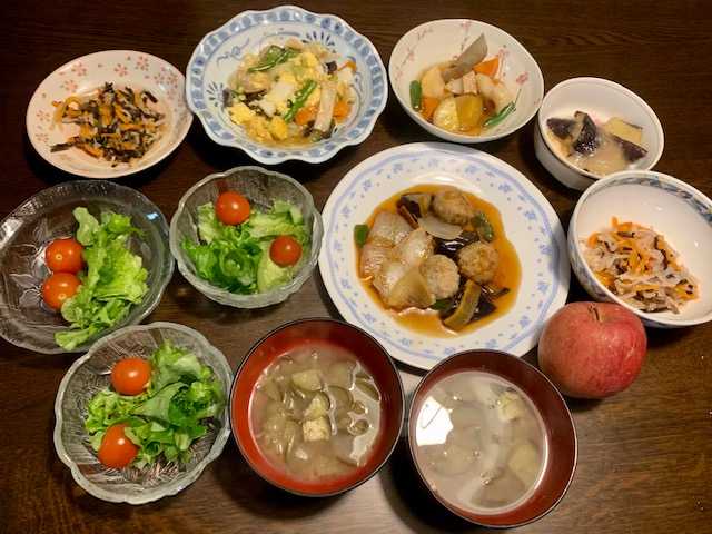 夕食は、鶏つくね・玉ねぎ・茄子・ピーマン・人参煮、じゃがいも・さつまいも・蒟蒻・人参・蓮根・ごぼう・隠元煮、海老・烏賊・キャベツ・筍・人参・にんにくの芽・木耳炒め、なすのおろし煮、大根・人参・木耳の梅味なます、もやし・人参・筍・気らげ・山ぜりのナムル、サニーレタス・ミニトマト、ナスの味噌汁、りんご。鶏つくね・玉ねぎ・茄子・ピーマン・人参煮。海老・烏賊・キャベツ・筍・人参・にんにくの芽・木耳炒め。じゃがいも・さつまいも・蒟蒻・人参・蓮根・ごぼう・隠元煮。なすのおろし煮。大根・人参・木耳の梅味なます。もやし・人参・筍・気らげ・山ぜりのナムル。サニーレタス・ミニトマト。茄子の味噌汁。りんご。