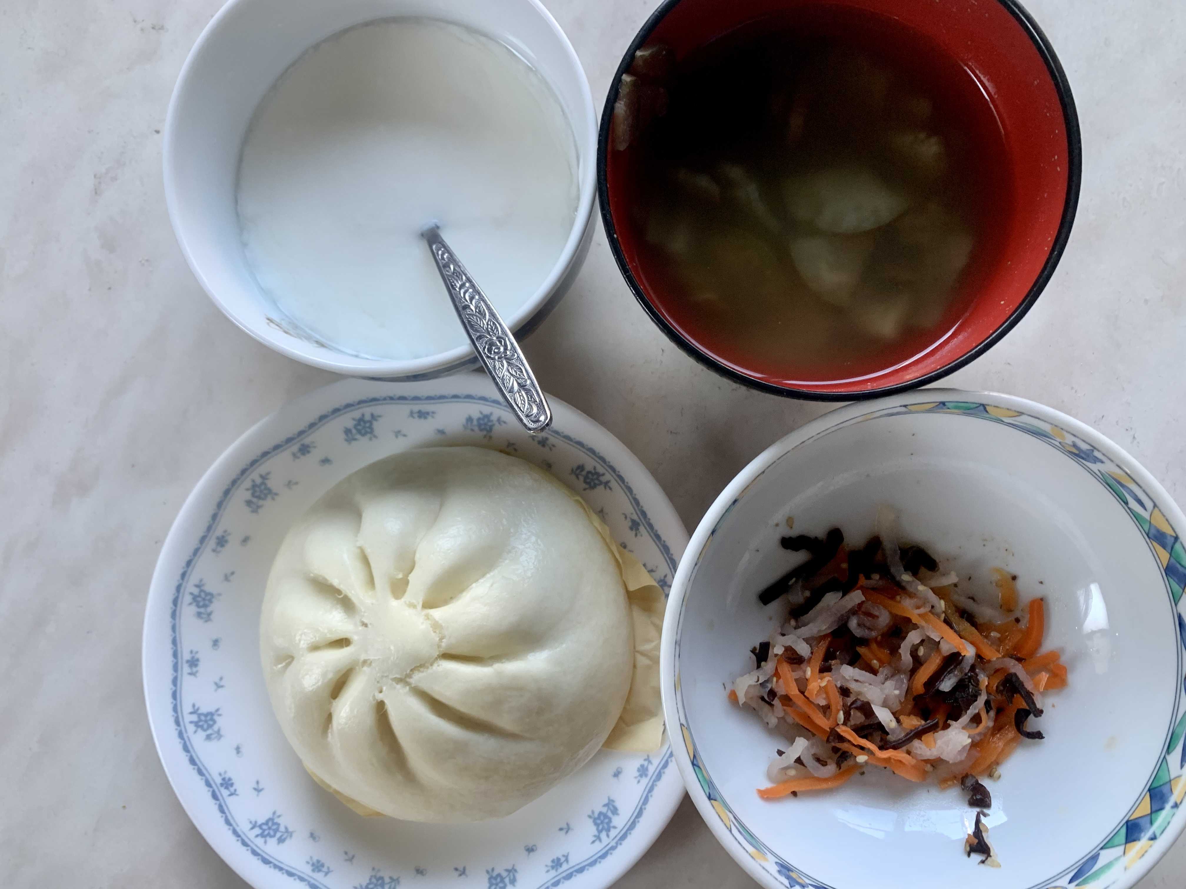 朝食は、肉まん、カスピ海ヨーグルト、大根・人参・木耳のなます、茄子の味噌汁。