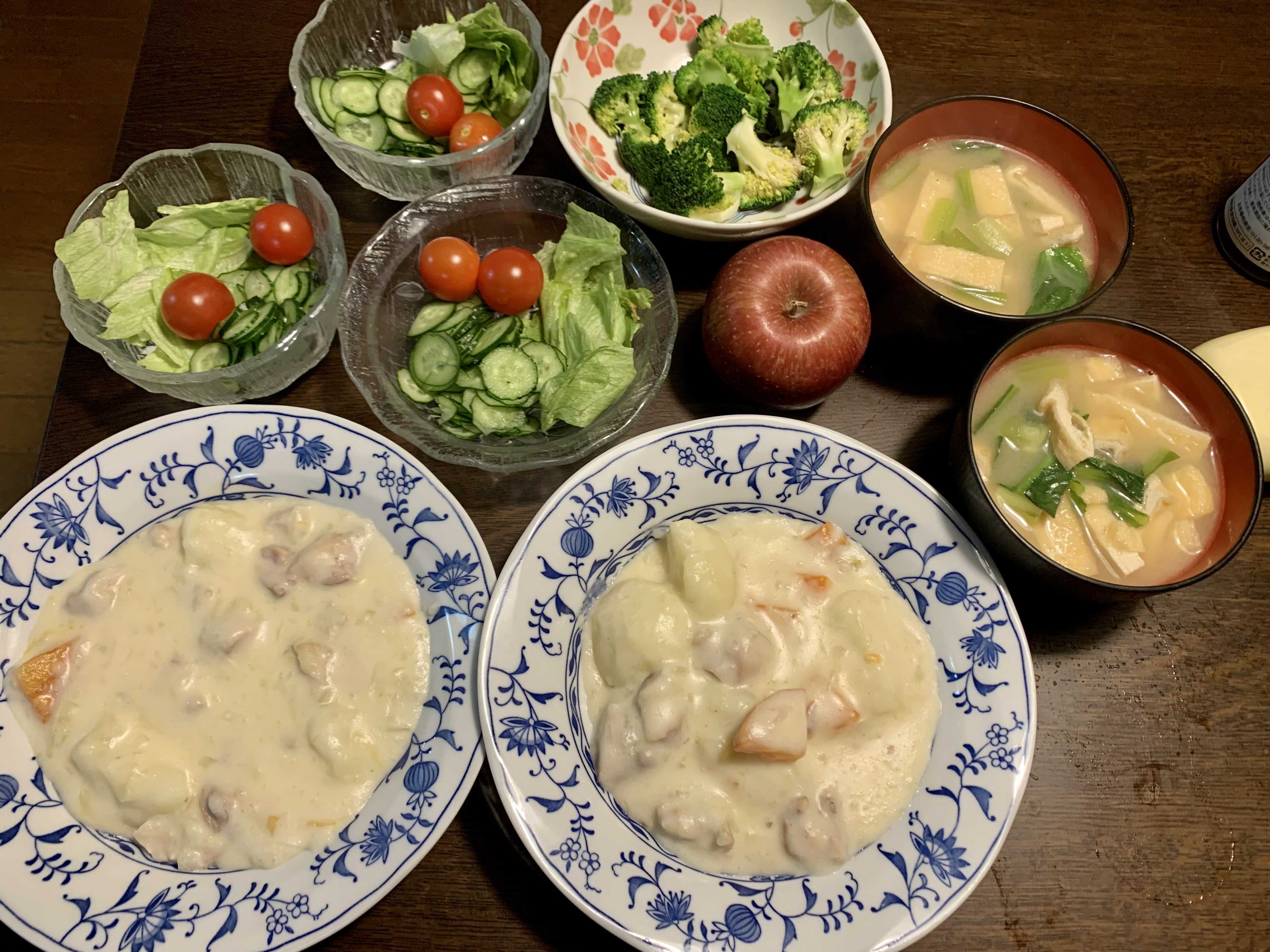 卓球の練習に行き、着替えてそのまま整形外科へ。年内の卓球練習は今日でおしまいですね。夕食は、チキンクリームシチュー(じゃがいも・人参・玉ねぎ)、蒸しブロッコリー、レタス・胡瓜・ミニトマト、油揚げ・小松菜の味噌汁、りんご。