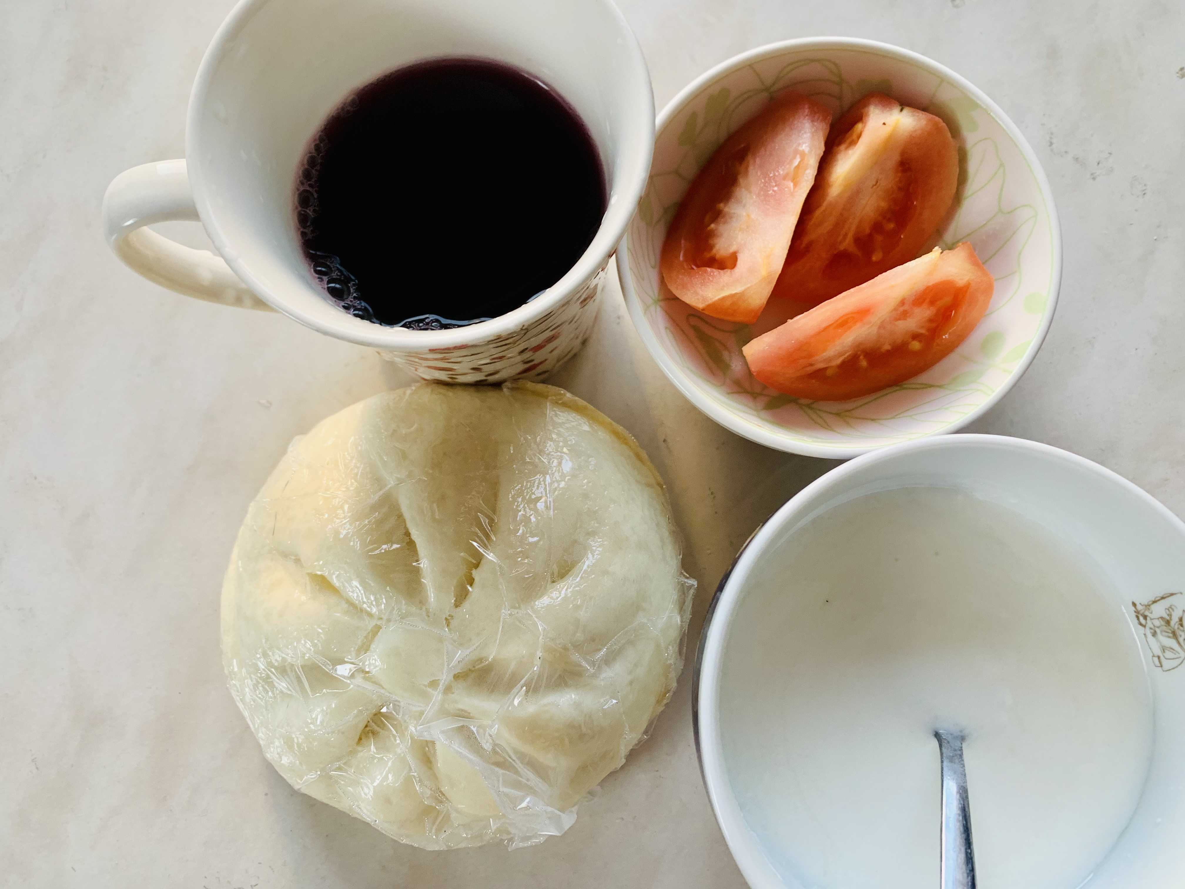 朝食は、肉まん、トマト、カスピ海ヨーグルト、グレープジュース。