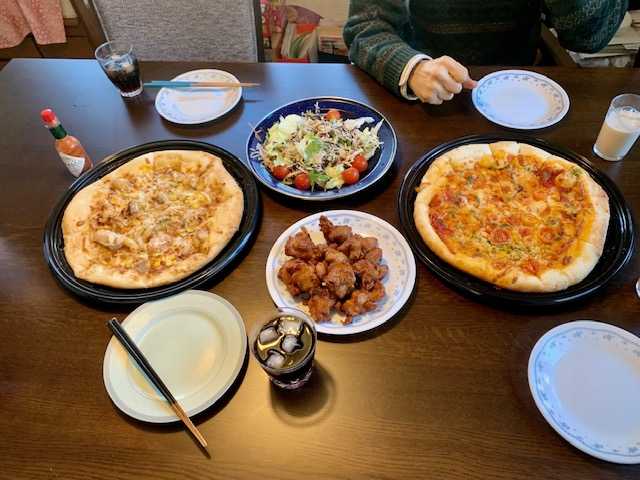 昼食は、ピザ(マルガリータ、照り焼きチキン)、唐揚げ、ミニトマト・レタス・鶏・ひじき・キャベツなどのサラダ、豆乳・紅茶味、ドクター・ペッパー。デザートは、チョコモナカジャンボ・冬限定。T君も食べたそうだけど、袋のカシャカシャ音が気になるから、袋をあげたら、粉が出て大変w
