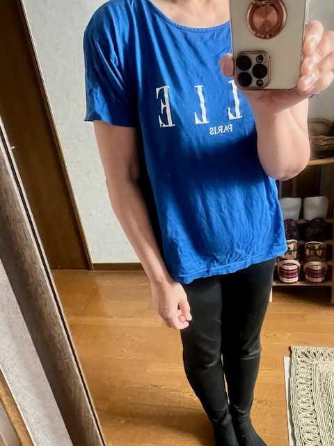 青・白のTシャツ、黒パンツ、黒靴下、黒のスリッポン。
