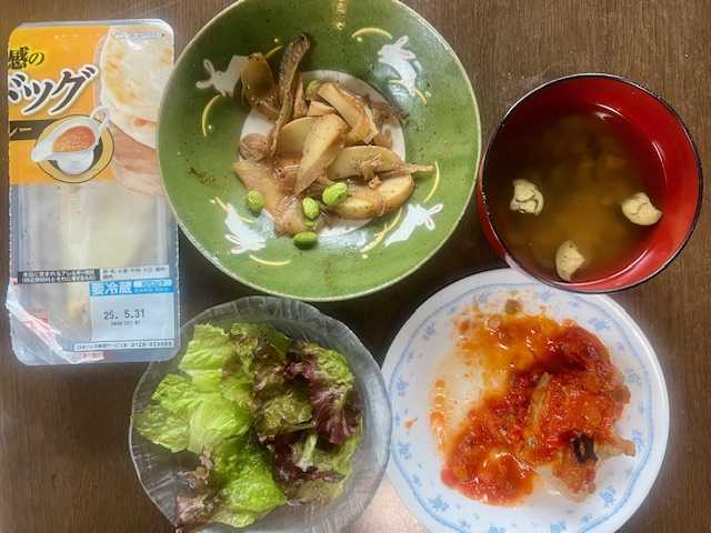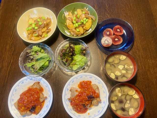 夕食は、グリルチキンの彩りトマトソース(赤ピーマン・黄ピーマン・茄子)、ウィンナー・じゃがいも・玉ねぎ・枝豆の粒マスタード炒め、サニーレタス、茄子の味噌汁、レッドキウイ。