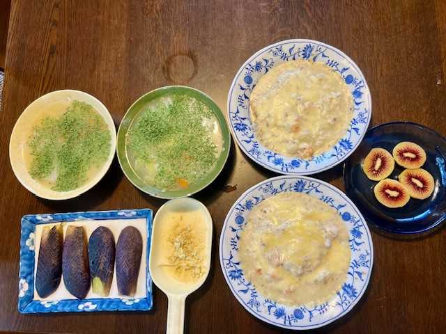 夕食は、海老クリームドリア、蒸し茄子・生姜・ポン酢、白玉団子・白菜・人参の鶏ガラスープ・乾燥パセリ、レッドキウイ。体重は、夕食後・入浴前57.8kg。2日前から0.2kg減った。33.5%。入浴後、57.6kg。入浴前から0.2kg減った。31.9%。