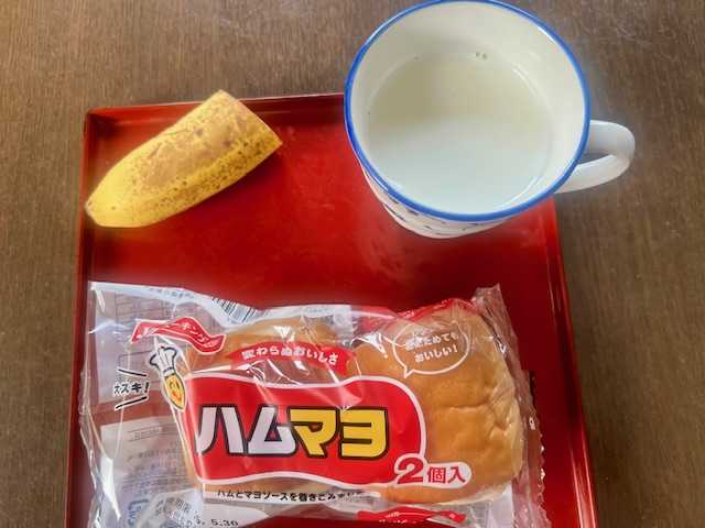 朝食は、ハムマヨパン、バナナ、牛乳。
