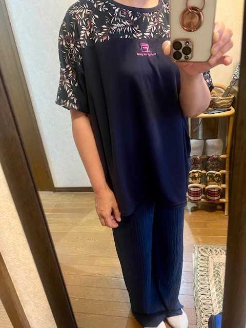 紺・白・ピンク・茶の水陸両用Tシャツ、シャーリングパンツ、白・青の靴下、黒・グレーのストレッチシューズ。卓球には、紺・青・水色の卓球ユニフォーム、黒・青のスコート、白・青の靴下、黒・グレーのストレッチシューズ。青のカーディガン、紺のシャーリングパンツ。