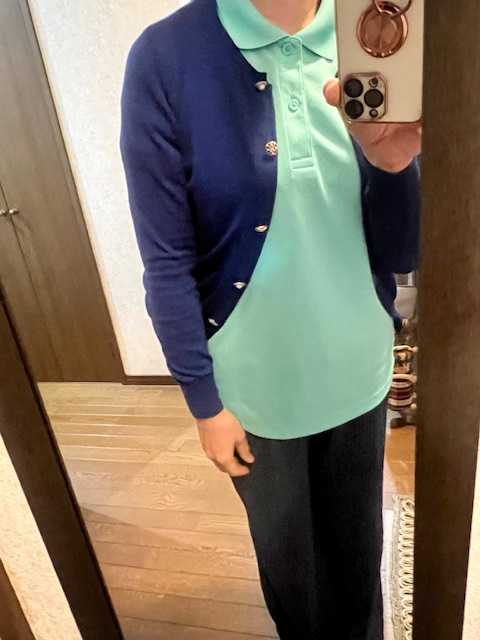 ミントグリーンのポロシャツ、青のカーディガン、紺のシャーリングパンツ、白・青の靴下、黒・グレーのストレッチシューズ。卓球には、紺・青・水色の卓球ユニフォーム・スコート、白・青の靴下、黒・グレーのストレッチシューズ。紺のシャーリングパンツ。