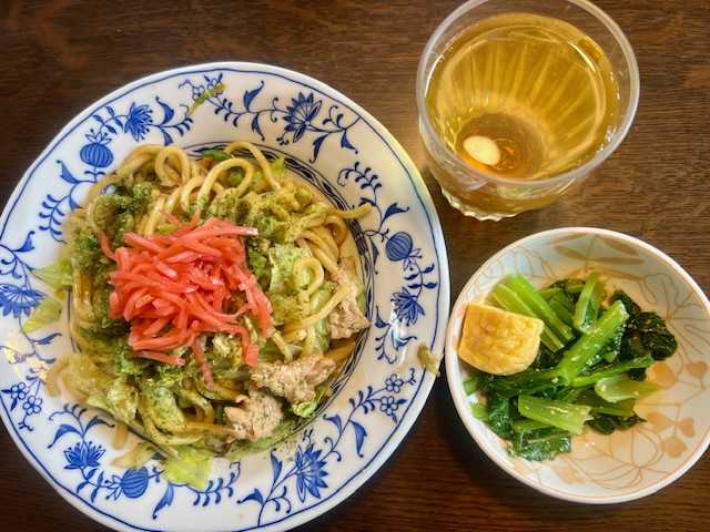 夫とスーパー・フーコットで買い物。雨が強く降ってたのに、混んでましたね。やはり安売りスーパーは求められているのだろうなあ。昼食は、太麺焼きそば・青海苔・紅生姜、卵焼き、小松菜の胡麻和え、緑茶。