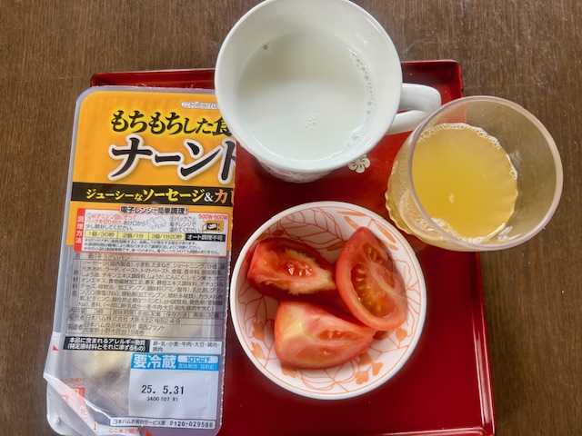 朝食は、ナーンドッグ(ソーセージ・カレー・ナン)、トマト。牛乳、パインジュース。