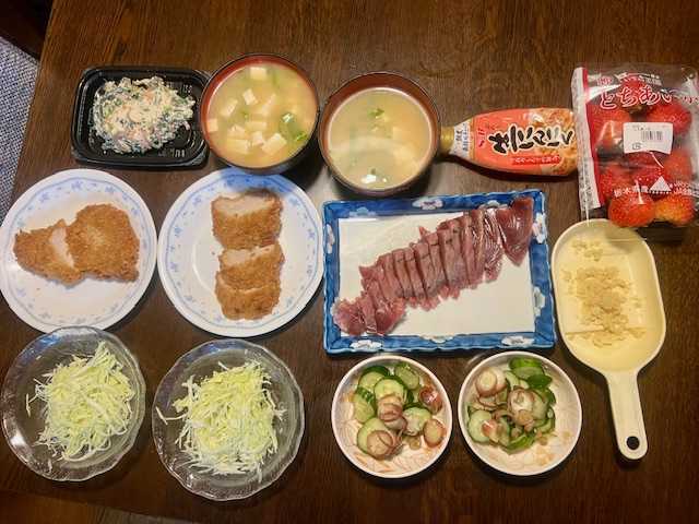 夕食は、ヒレカツ、千切りキャベツ、鰹の刺身・生姜・にんにく・醤油、胡瓜・茗荷、ほうれん草・人参・蒟蒻の白和え、豆腐・ネギの味噌汁、いちご・とちあいか。