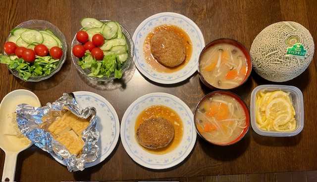夕食は、おろしハンバーグ、厚揚げ・生姜・ポン酢、ミニトマト・胡瓜・サニーレタス、しめじ・人参・もやしの味噌汁、レモンの砂糖漬け、青玉メロン・茨木県産イバラキング。体重は、夕食後・入浴前58kg。2日前から0.2kg増えた。体脂肪率は、34.8%。入浴後、変わらず。31.9%。