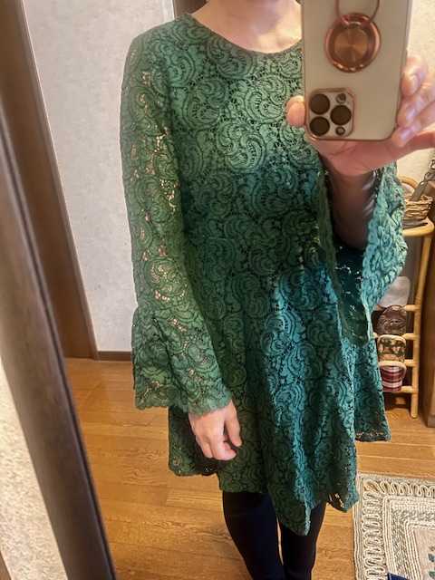 緑のレースチュニック、黒スパッツ、黒靴下、紺のレインシューズ。黒・白のジャンバー。