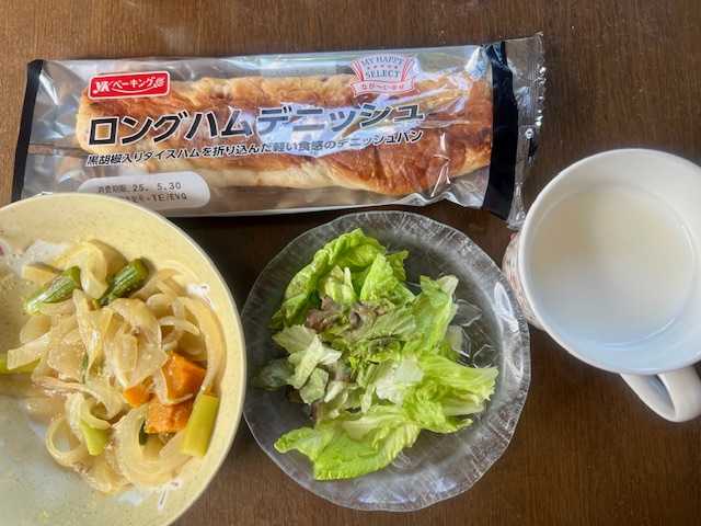 朝食は、ロングハムデニッシュ、鶏・南瓜・玉ねぎ・アスパラのコンソメ煮、サニーレタス、牛乳。