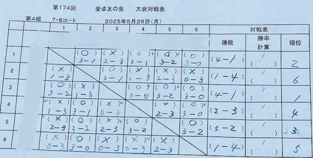 愛卓友の会大会にKさんと参加。4組4勝1敗相対負けで2位3-0,3-1,3-1,3-2,2-3フルゲームジュースで逆転負けで悔しかった。3-0 IYさん・FMさん 裏裏・表裏 6位10-1211-811-611-5ジュース取り切りたかった。横上・横下サーブが効いたが後からIYさんには打たれた。FMさんには横上サーブが割と効いた。IYさんのドライブを2本返せた。2-3 OAさん・OKさん 裏裏・粒裏 1位8-1113-1111-77-1110-12フルゲームジュースで逆転負けしてしまった。OAさんのバックスマッシュが鋭い。OKさんの粒が止まる。横上サーブが割と決まった。 (Fさん・私 1-3 OAさん・OKさん 裏・粒裏10-1111-65-118-11)3-1 MKさん・SHさん 裏裏・表裏 4位13-1111-48-1111-5ジュース取り切れて良かった。2人共打ってくる。横上・横下サーブが割と効いたが、慣れられて打たれた。ショートサーブに変更したり、また戻したりした。Kさんのアップサーブの3球目や浮いた球は打つようにした。3-2 HMさん・FMさん 裏ペン・裏ペン 3位8-1111-911-32-1111-7フルゲーム勝ちきれて良かった。HMさんのアップサーブの3球目をFMさんに打たれてしまう。横上・横下サーブが効いた。Kさんのアップサーブの3球目を打って決められた。打ちミスもあったけど、やはり打った方がいいのかも。 (3-1 HMさん・FMさん 裏・裏 3位6-1111-813-1111-9HMさんのアップサーブの3球目をFMさんが打ってくる。フォアではなくバックにレシーブしないといけない。Kさんのアップサーブの3球目もやっと打てるようになってきた。無理には打たず、まずは入れることが必要だけど。下切りロングサーブはHMさんに打たれてしまった。)3-0 NYさん・SYさん 裏裏・裏裏 5位11-813-1111-2ジュース取り切り、ストレート勝ち。SYさんの横上サーブのレシーブがオーバーしてしまう。打った方が良かったのかな。後からはつっつきでもなんとか入った。入ると横回転が残ってるせいかNYさんがミスしてくれたりした。横上・横下・ショート・バズーカサーブが効いた。KさんもYGサーブまで出して効いていた。