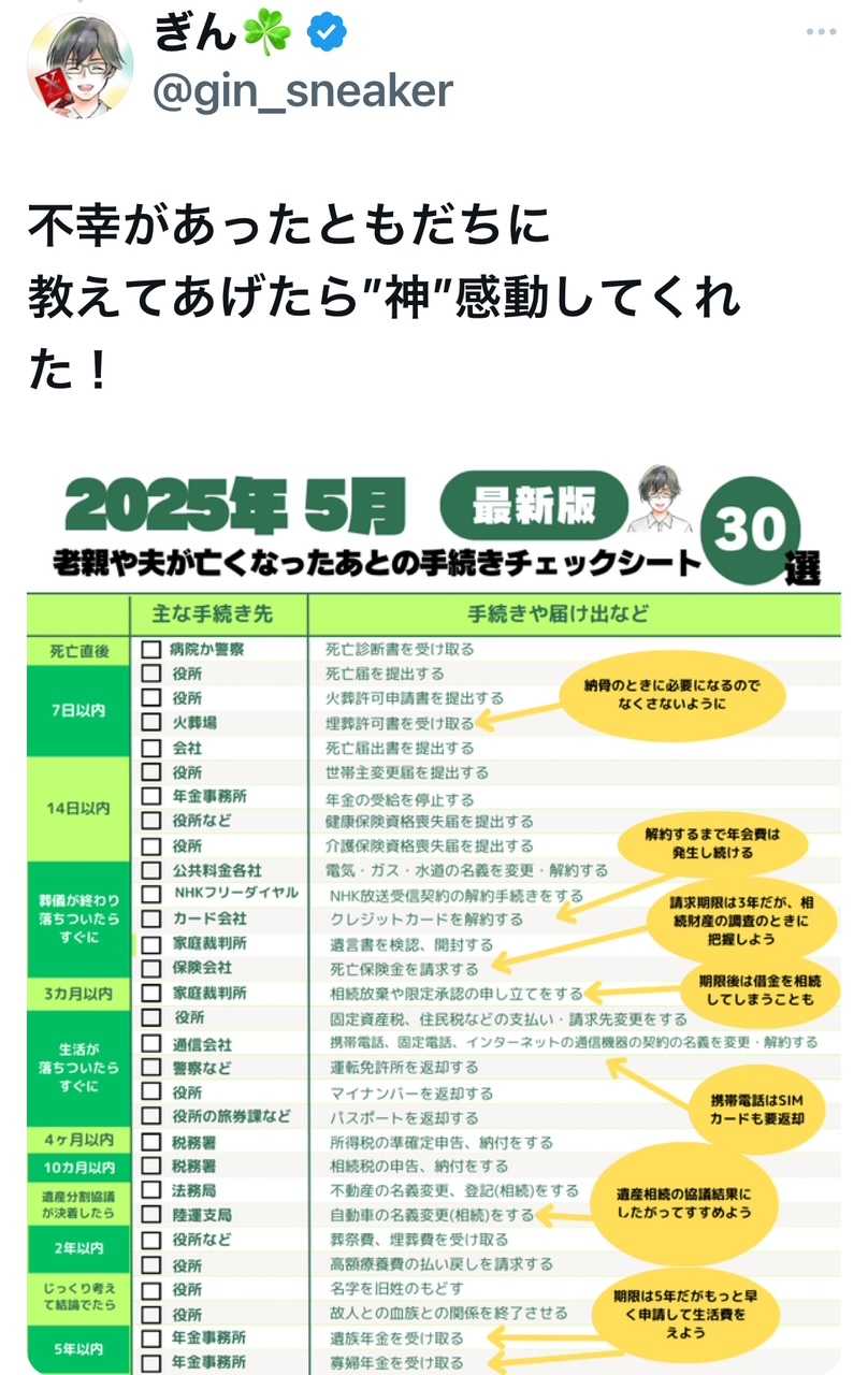 親や夫の死後手続きチェックシートをXで見かけました。ぎんさんのポストです。私と夫の親はもう4人共亡くなってしまったのですが、もし夫が亡くなったらと思うと不安です。その時は、これをまた見ようかな。(20) ぎん☘️(@gin_sneaker)さん / Xチェックシート。もめない為の手続きチェックシート。