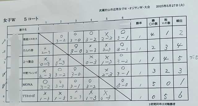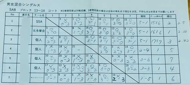 武蔵村山ダブルス大会にFさんと参加。5組 4勝1敗 1位にフルゲーム負けフルゲーム2勝1敗3-0,3-1,3-2,3-2,2-33-2 YYさん・Hさん(たらの芽) 裏裏・表裏 4位9-1111-78-1111-711-9フルゲーム勝ちきれて良かった。横上・横下・ショート・巻き込みサーブが割と効いた。横上サーブの3球目をFさんが打ってくれたりした。私もつっつきだけでなく、なるべく打つようにした。2人共打ってくる。ブロックとかで対応した。(1位のHペアに3-2先日青梅シングルスでHさんに負けたからリベンジ)3-0 Mさん・Hさん(よつ葉会)裏裏・裏 5位11-211-511-7横上・横下・ショート・巻き込みサーブが効いた。バズーカサーブは打ち返された。 (3-1 Tさん・Mさん室田(よつば会)表裏11-511-710-1211-4ジュースはまた取りきれなかったが、勝ちきれて良かった。横下サーブが割と効いた。)3-2 Kさん・Mさん(中野フレンズ)表裏・表裏 3位9-1111-412-1313-1211-7ジュース取り切ってフルゲーム勝ちきれて良かった。Kさんに横上・横下サーブが割と効いたが、後から打たれてしまったので、巻き込み・バズーカサーブが決まった!バズーカは裏面で打ったから驚かれた。ショートサーブもドライブで打たれて、出すサーブが無くなったのですよね。バンバン2人共打ってくるから、なんとかブロックした。ストレートを狙ったら決まった。 (3-0 Mさん・Kさん(中野フレンズ)表裏・表 4位11-812-1011-62人共打ってくるがオーバーミスも。横下サーブが一回効いた。バックへのレシーブが決まった。)2-3 Yさん・Mさん(MONA)表裏・粒裏 1位13-116-1110-1212-105-11ジュース3回でフルゲームになったのに、勝ちきれなかった。Yさんには横上・横下サーブが効いた。粒のMさんにはナックルのロングサーブ出したが、取られる。ショートサーブは打ち分けられてしまう。 (八王子 3-2 Yさん(ファミリー)裏表11-1312-1011-78-1111-9横下・横上サーブは効いたが少し慣れられた。浮くと打たれてしまう。つっつき合いも引っかからなくなった。コースを突くといい。) 3-1 SMさん・MKさん(TTわかば)表裏・裏裏 6位11-811-55-1111-5SMさんの表のスマッシュが鋭い。横上・横下サーブがMKさんにはきいたが、SMさんには後から打たれてしまった。2位賞金2人で1,000円1位1,500円ブービー1,000円2位とブービーが同額? 少しは差をつけて欲しいなあw
