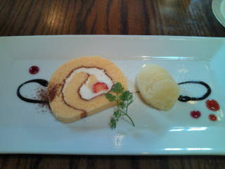 私は本日のデザートで、ロールケーキとグレープフルーツのシャーベット。