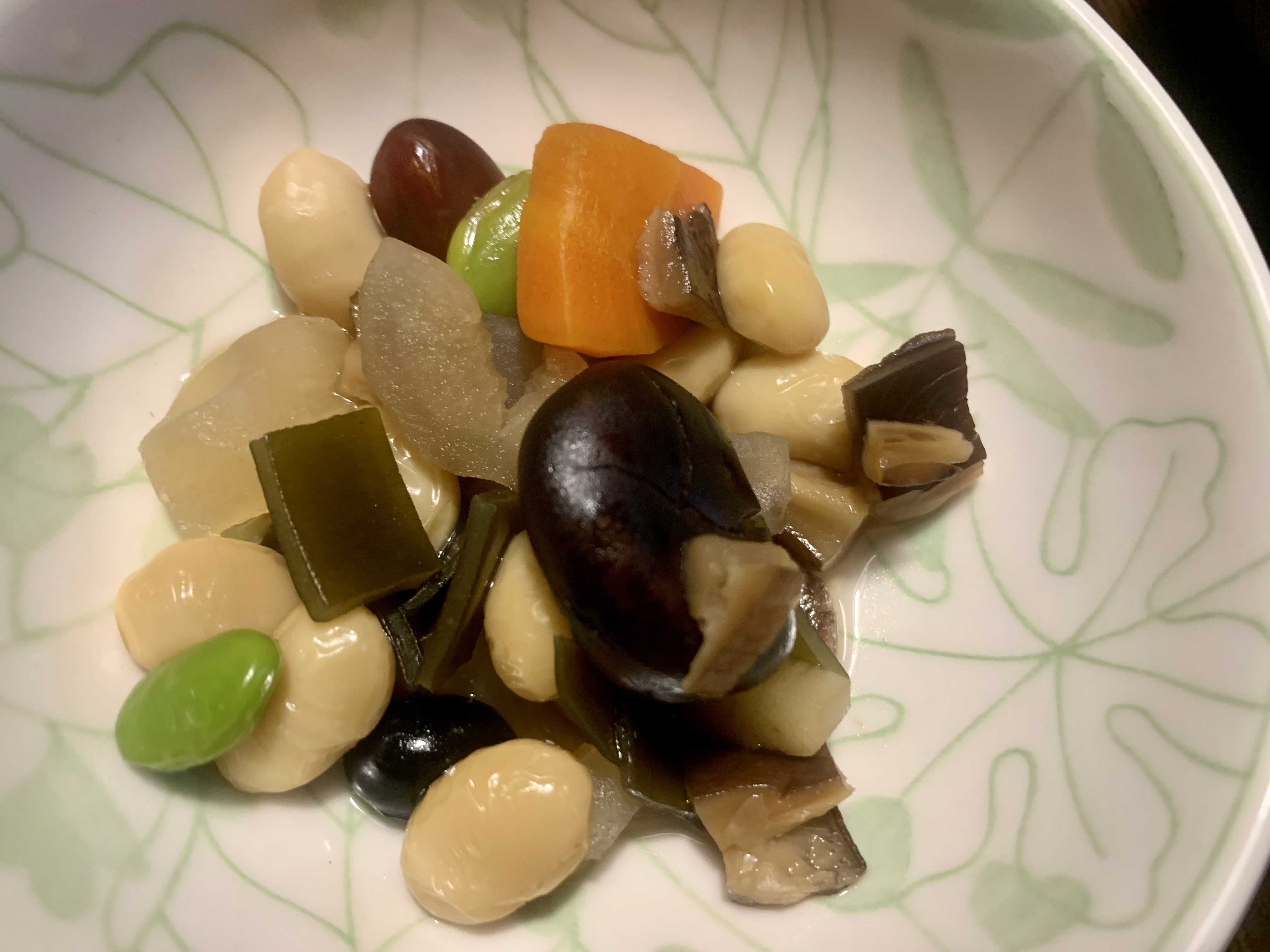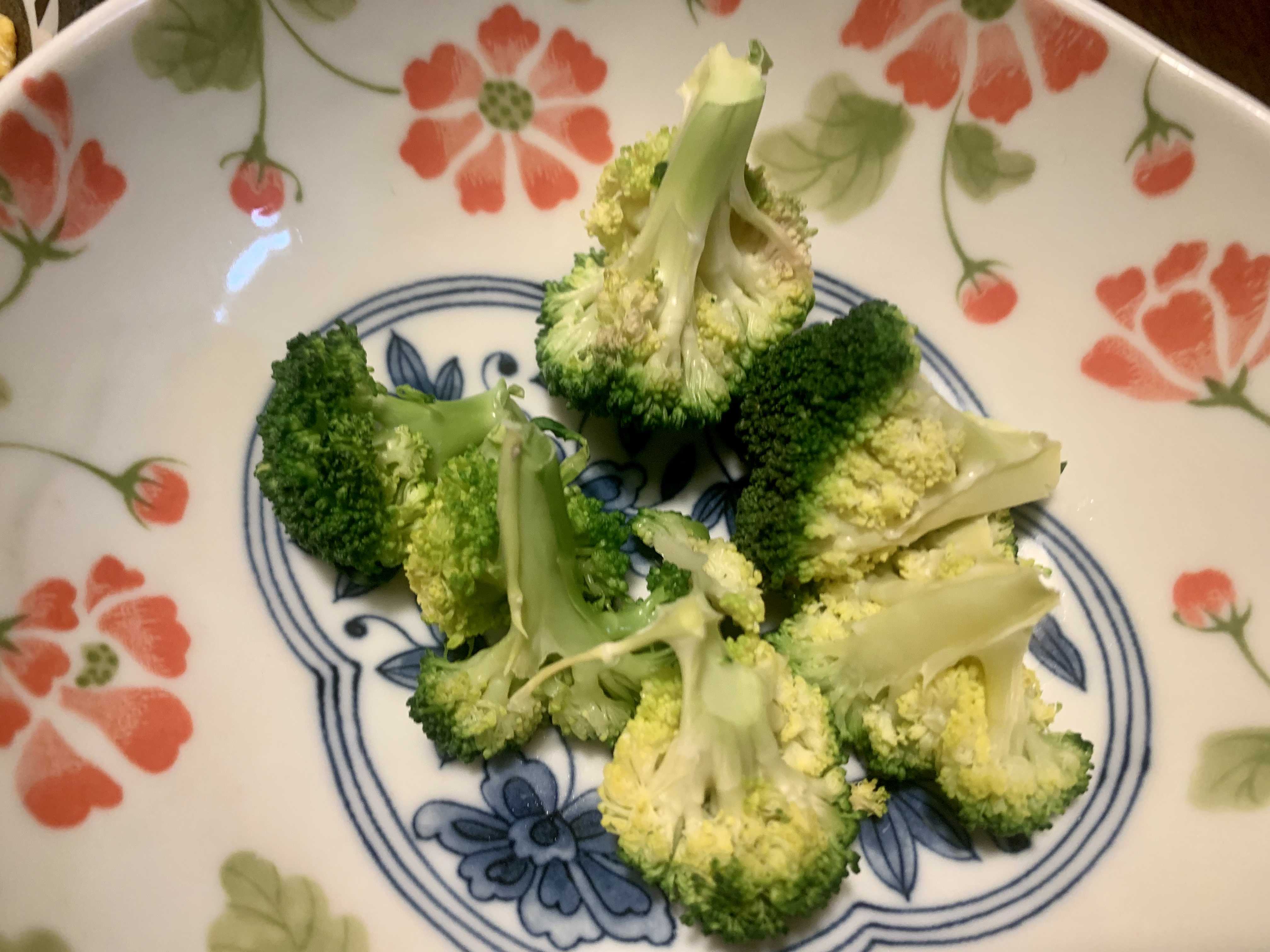夕食は、豚丼の具、五色豆、ニラ玉、キャベツ・人参・昆布のおひたし、蒸しブロッコリー、椎茸の味噌汁、みかん。