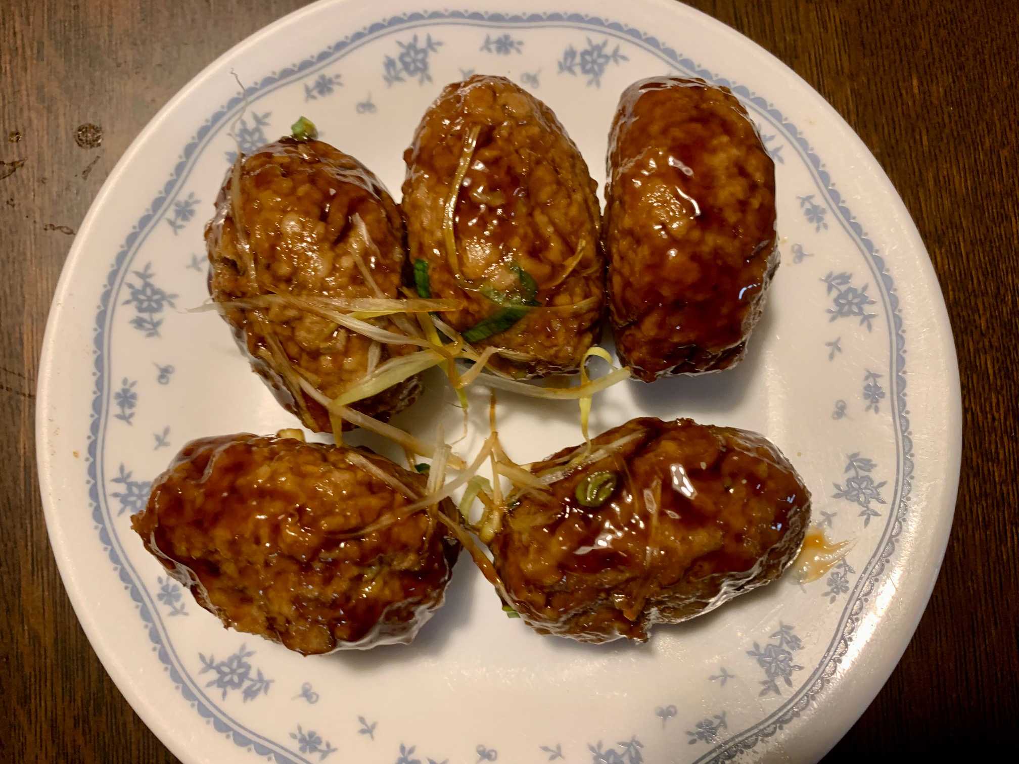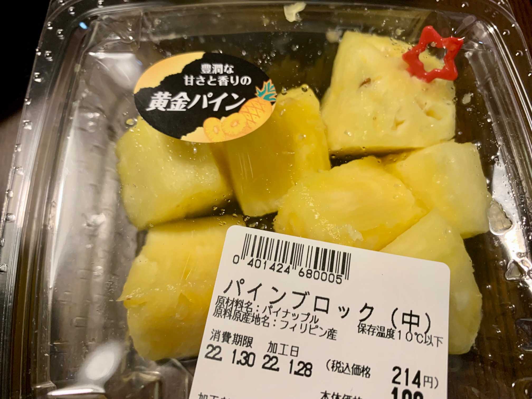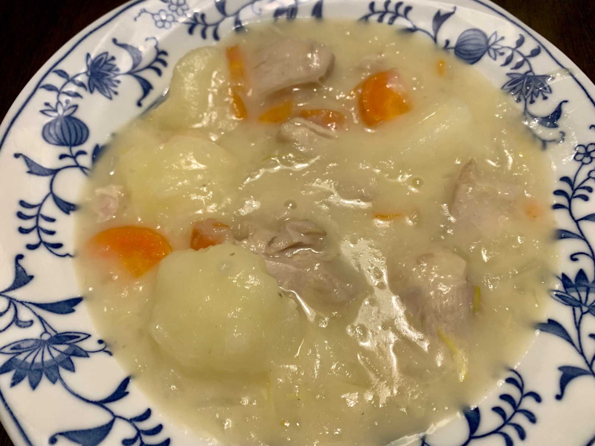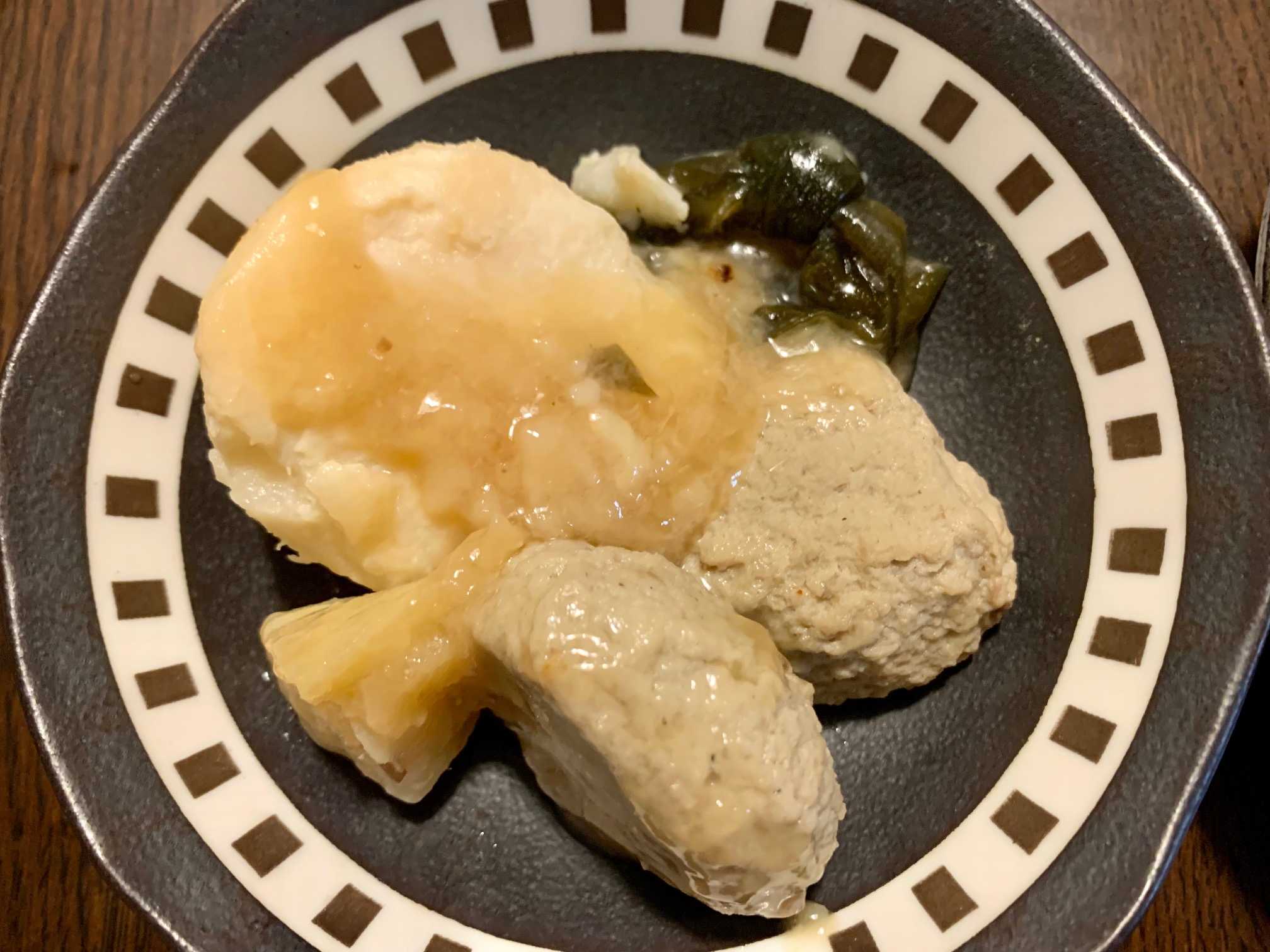 夕食はチキンクリームシチュー、軟骨入りつくね、おでん、麦ご飯、パイン。