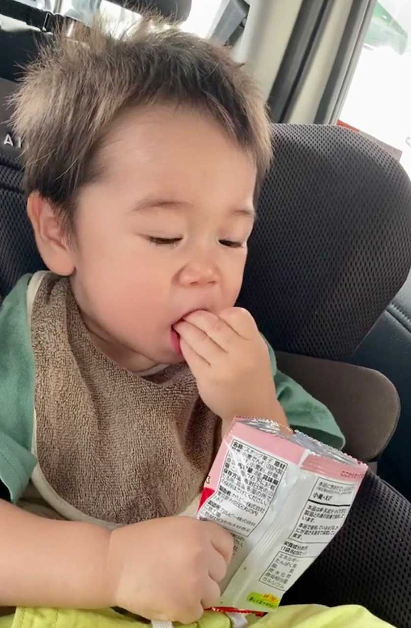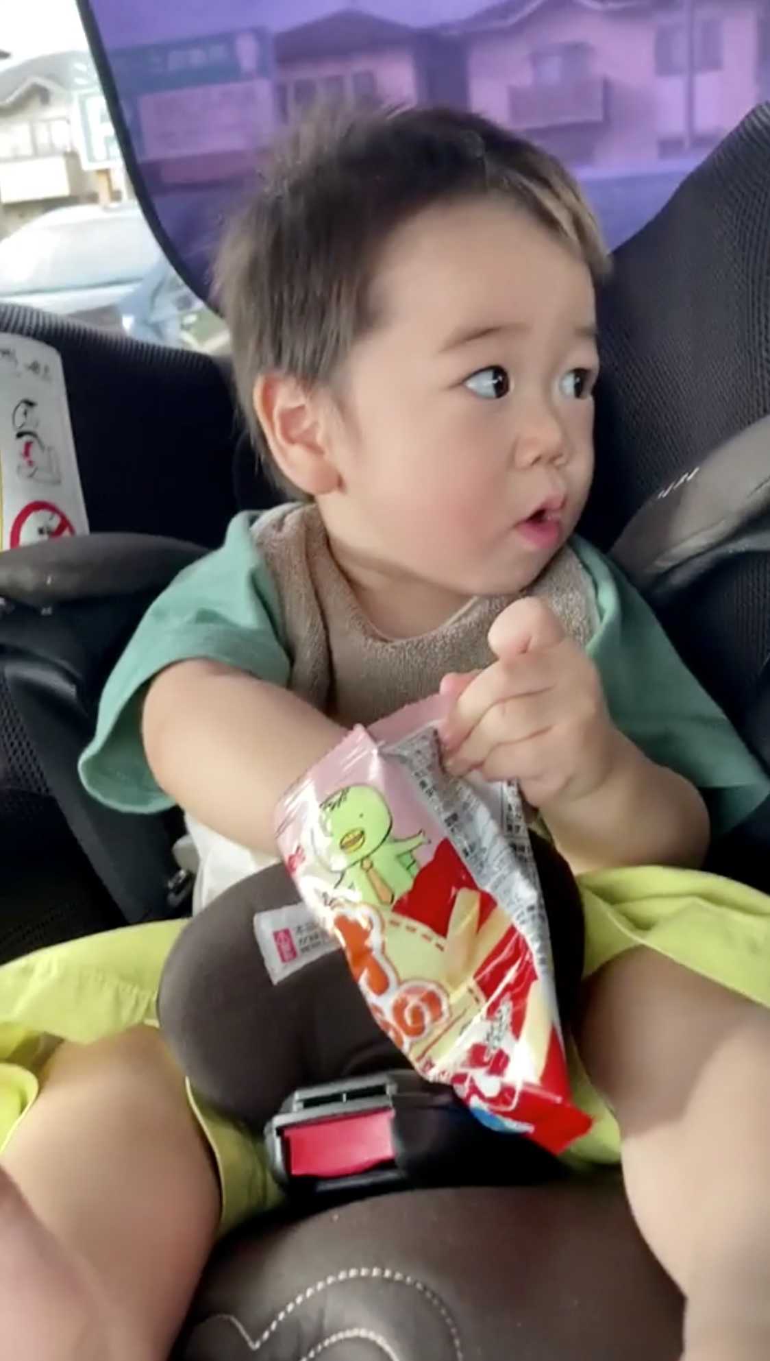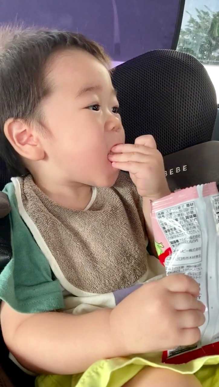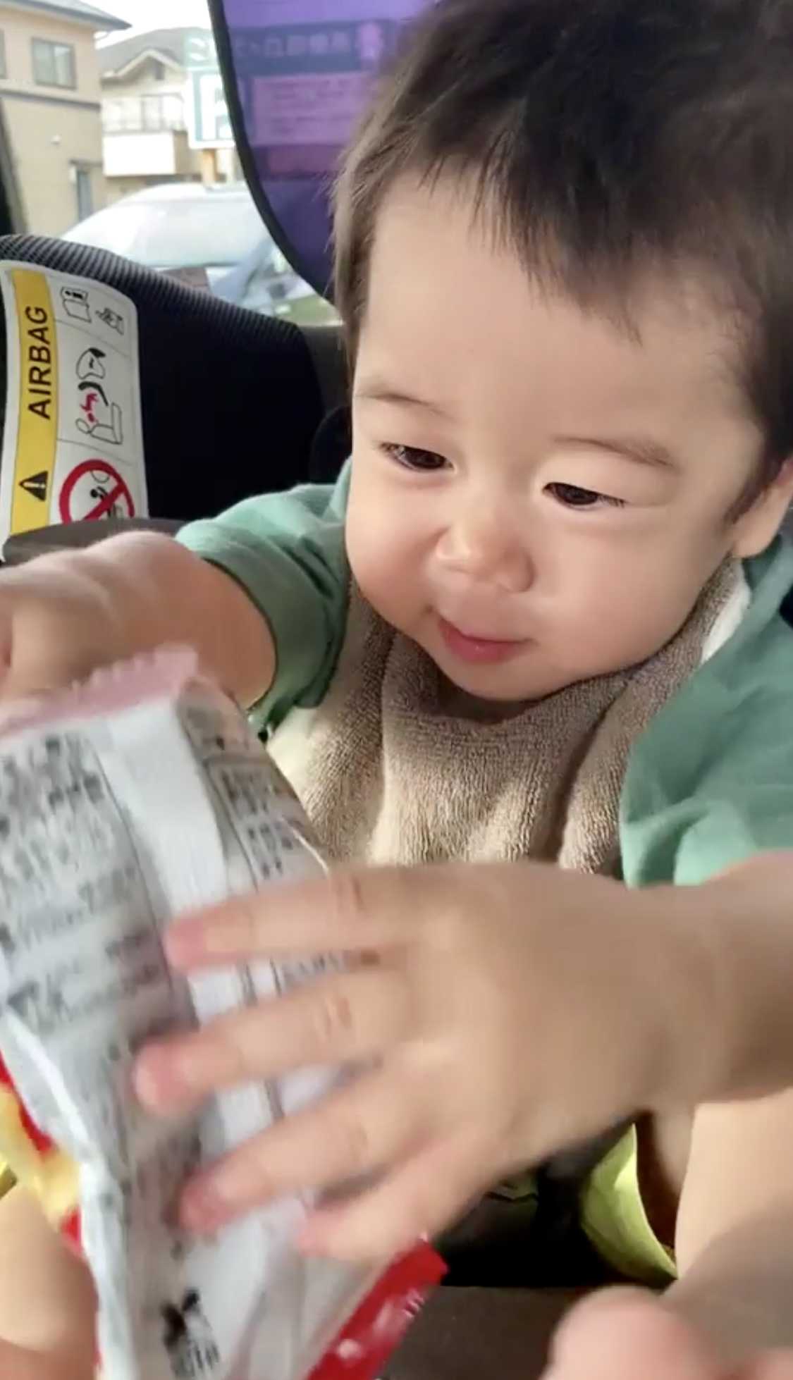 今日は予防接種でした。接種後30分車の中で待機なので、はじめてのお菓子一歳からのかっぱえびせんをあげました。