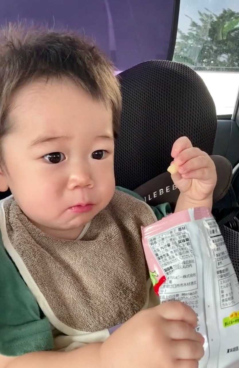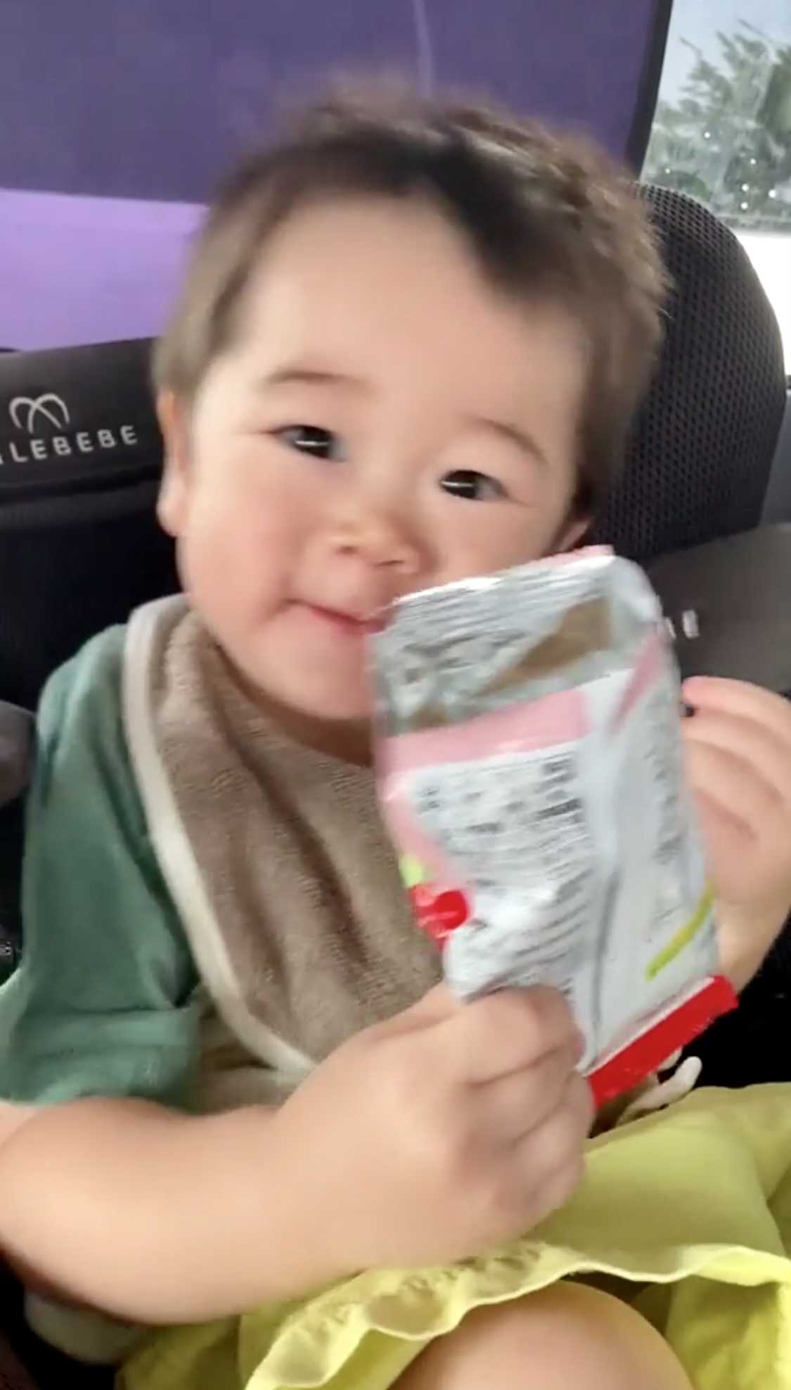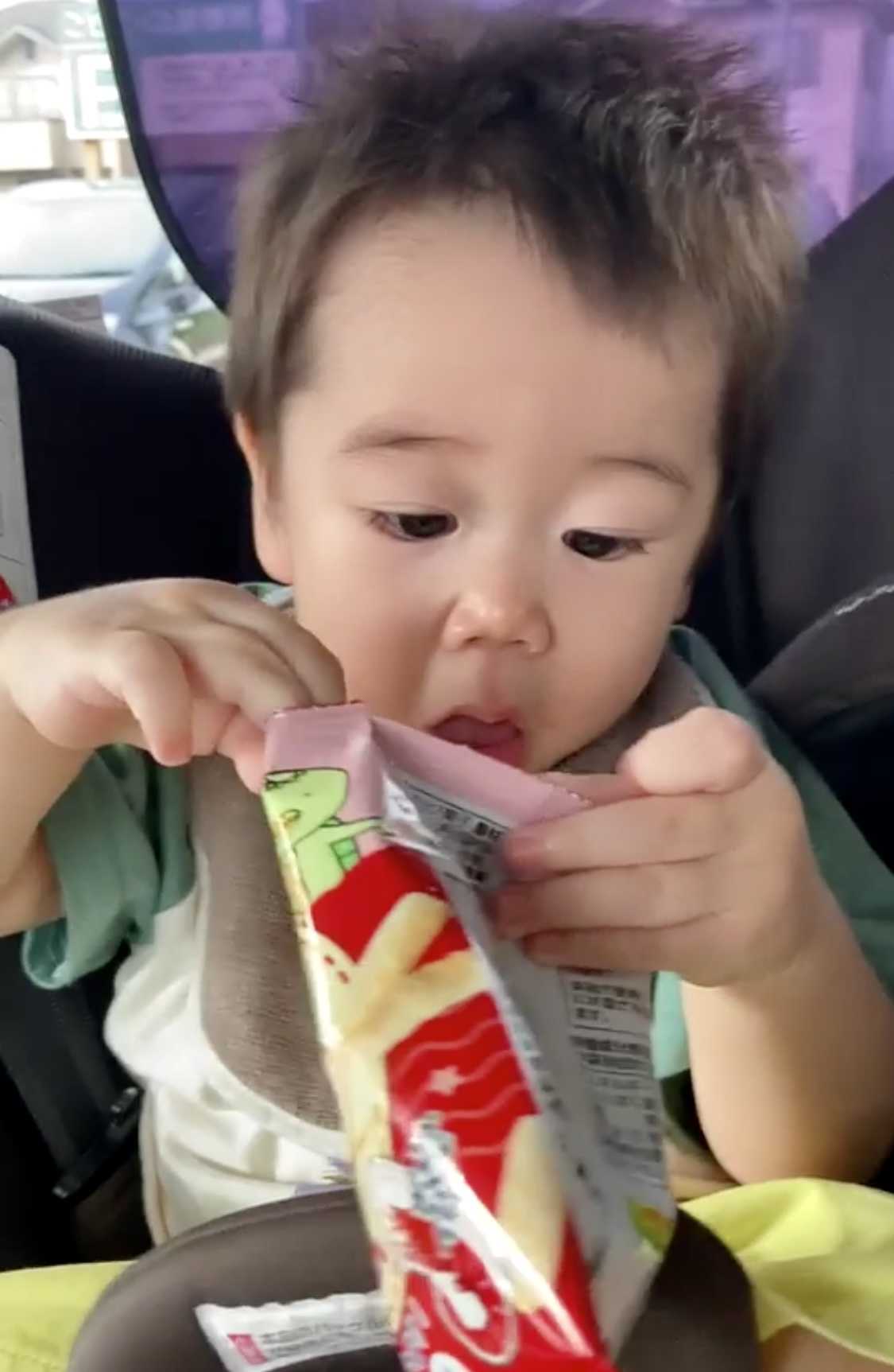 今日は予防接種でした。接種後30分車の中で待機なので、はじめてのお菓子一歳からのかっぱえびせんをあげました。