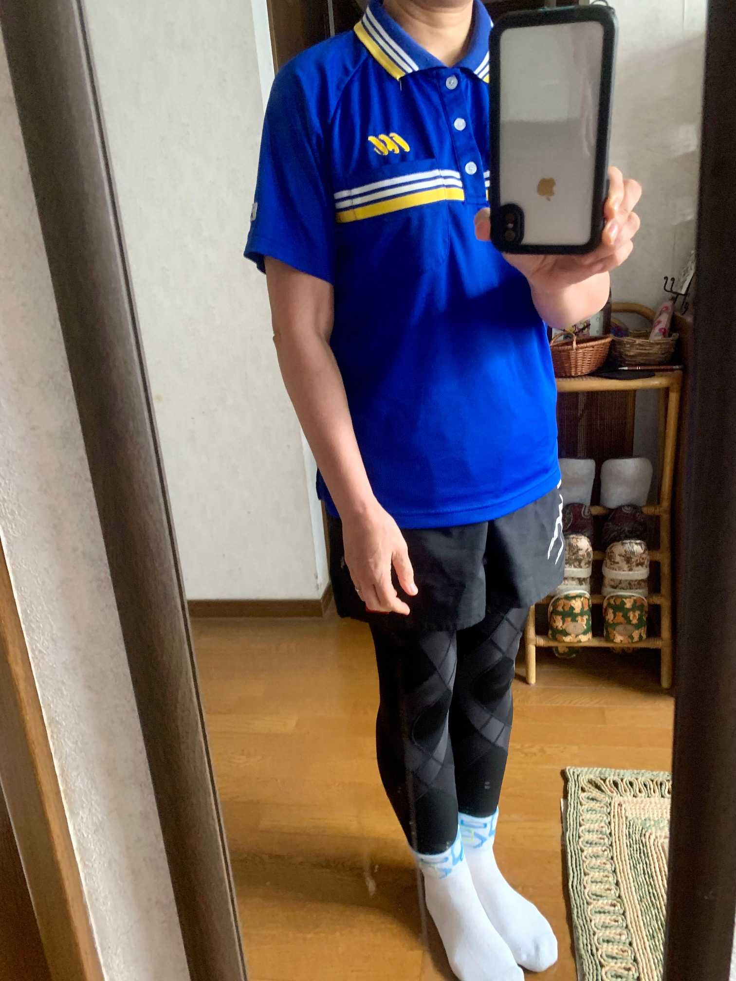 卓球には、青・白・黄色の卓球ウェア、黒・白のハーフパンツ、黒のスポーツスパッツ、白・青の靴下、黒のクロスゴム靴。