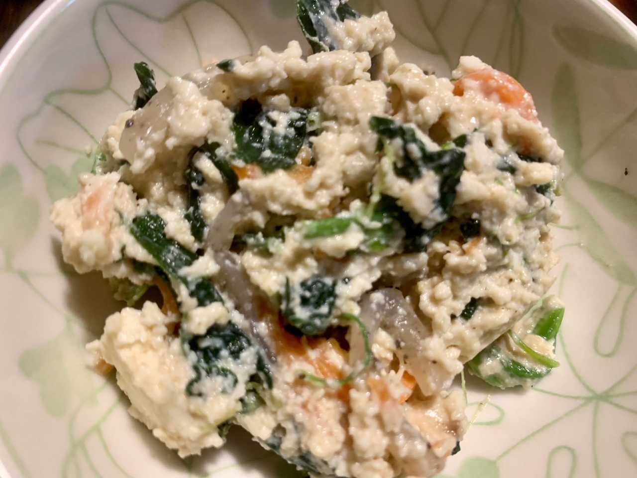 昼食は、海老・野菜のかき揚げ丼、蕪のマリネ、味噌汁。