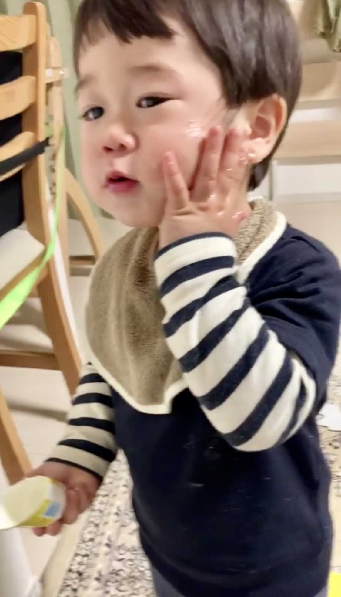 弟の顔の乳児湿疹にワセリンを塗ってたから、真似したのかな。