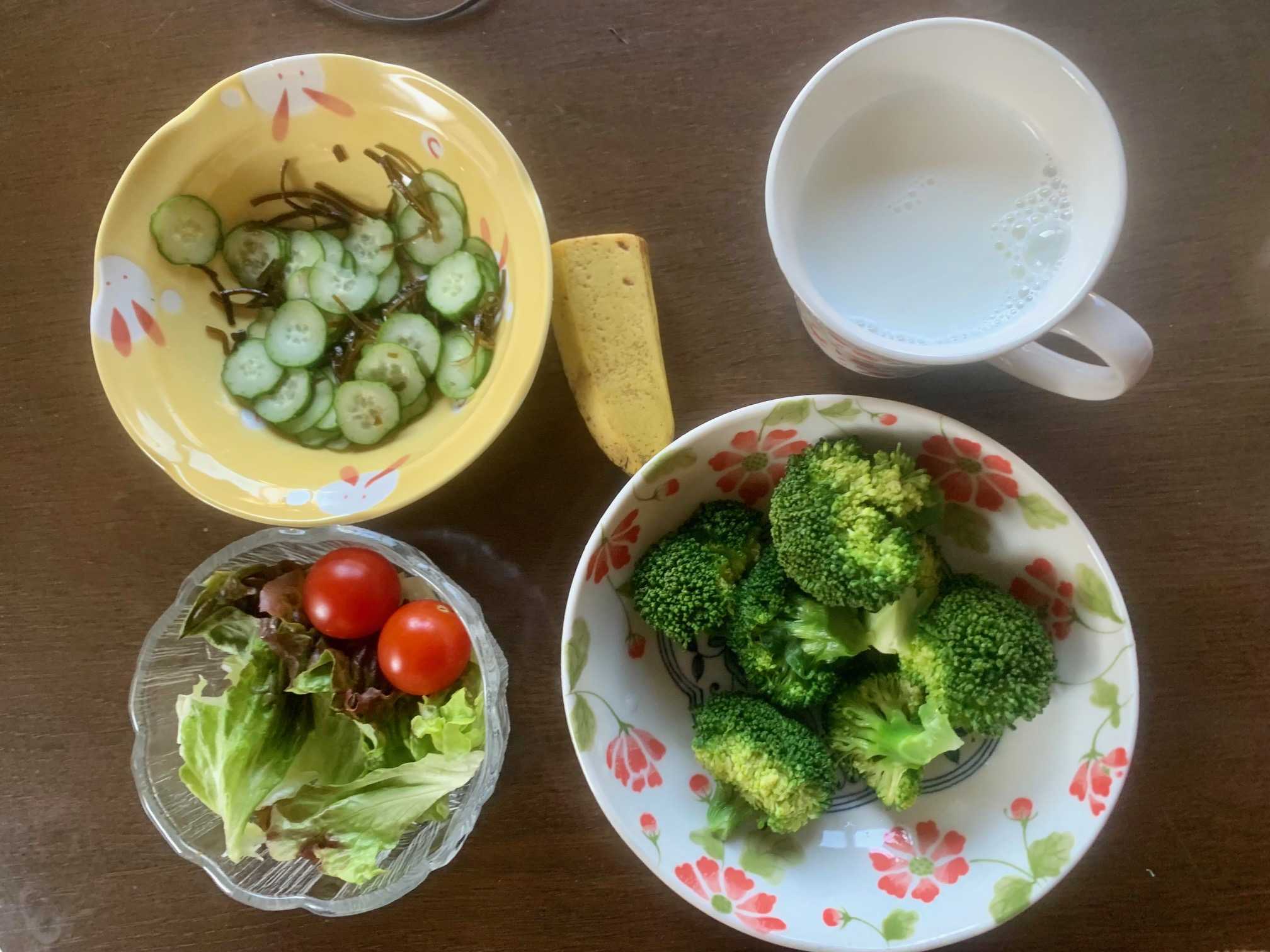 朝食は、バナナ、胡瓜の塩昆布和え、サニーレタス・ミニトマト、蒸しブロッコリー、牛乳、ヨーグルト。