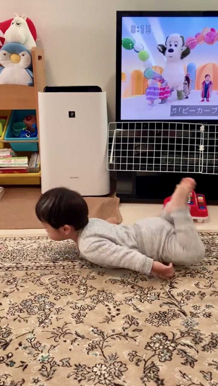 ピカピカブーの歌の中にでてくるヒコーキのポーズをやってます。