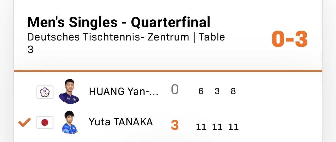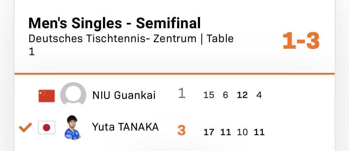 1ゲームジュース取り切ったのはすごい。3ゲームは逆転ジュースで取られたが4ゲームは切り替えてすごく攻めていった!(田中優勝すれば113位⇒71位で弟ルブランの真下にはつくか?牛君は国内だと樊振東に4-2.4-3とかでいつも惜しい所まで行ってますが国際試合だと結構まけてます。)
