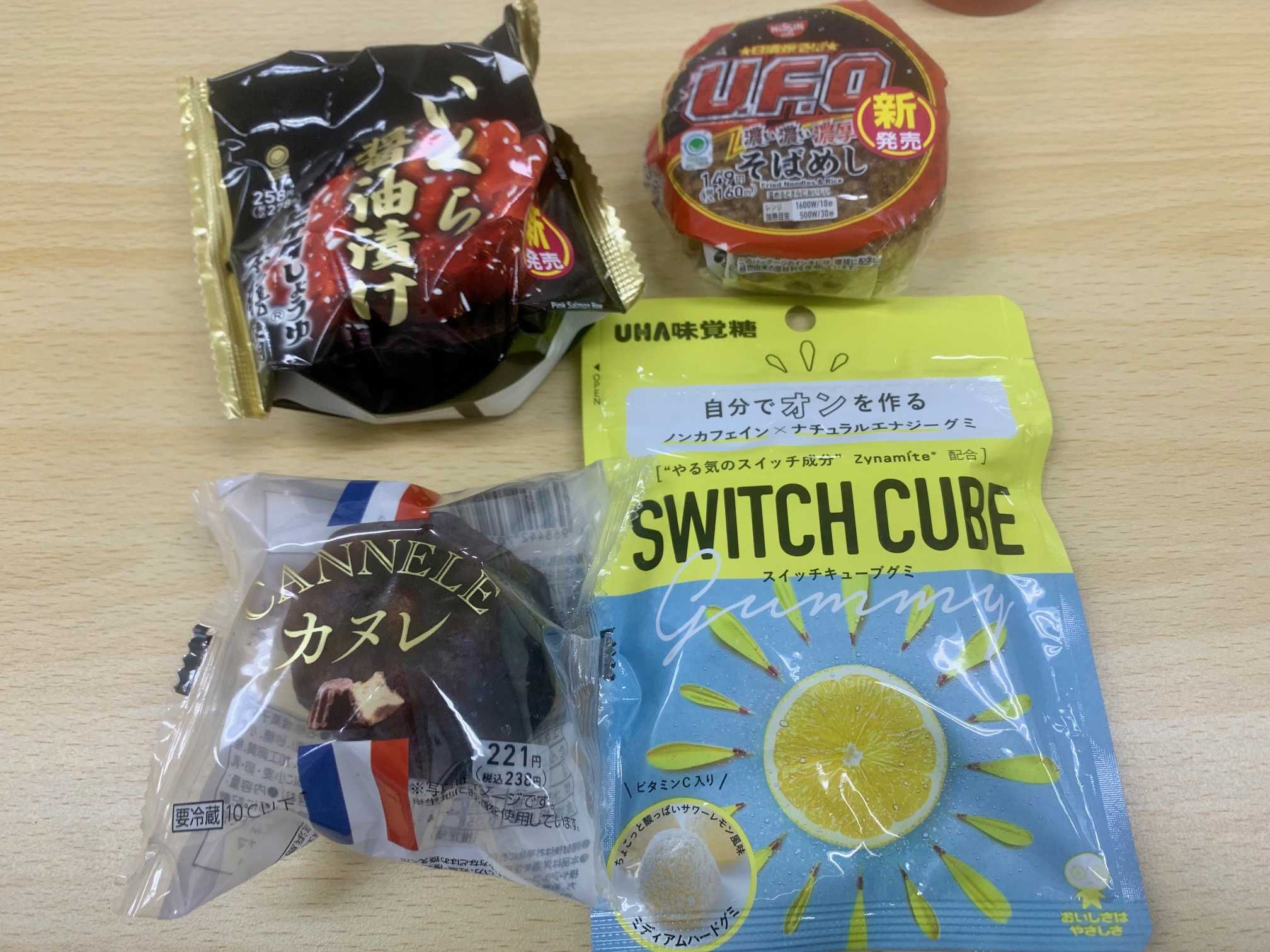 おにぎり(いくら醤油漬け、UFOそばめし)、カヌレ、スイッチチューブグミ・レモン。