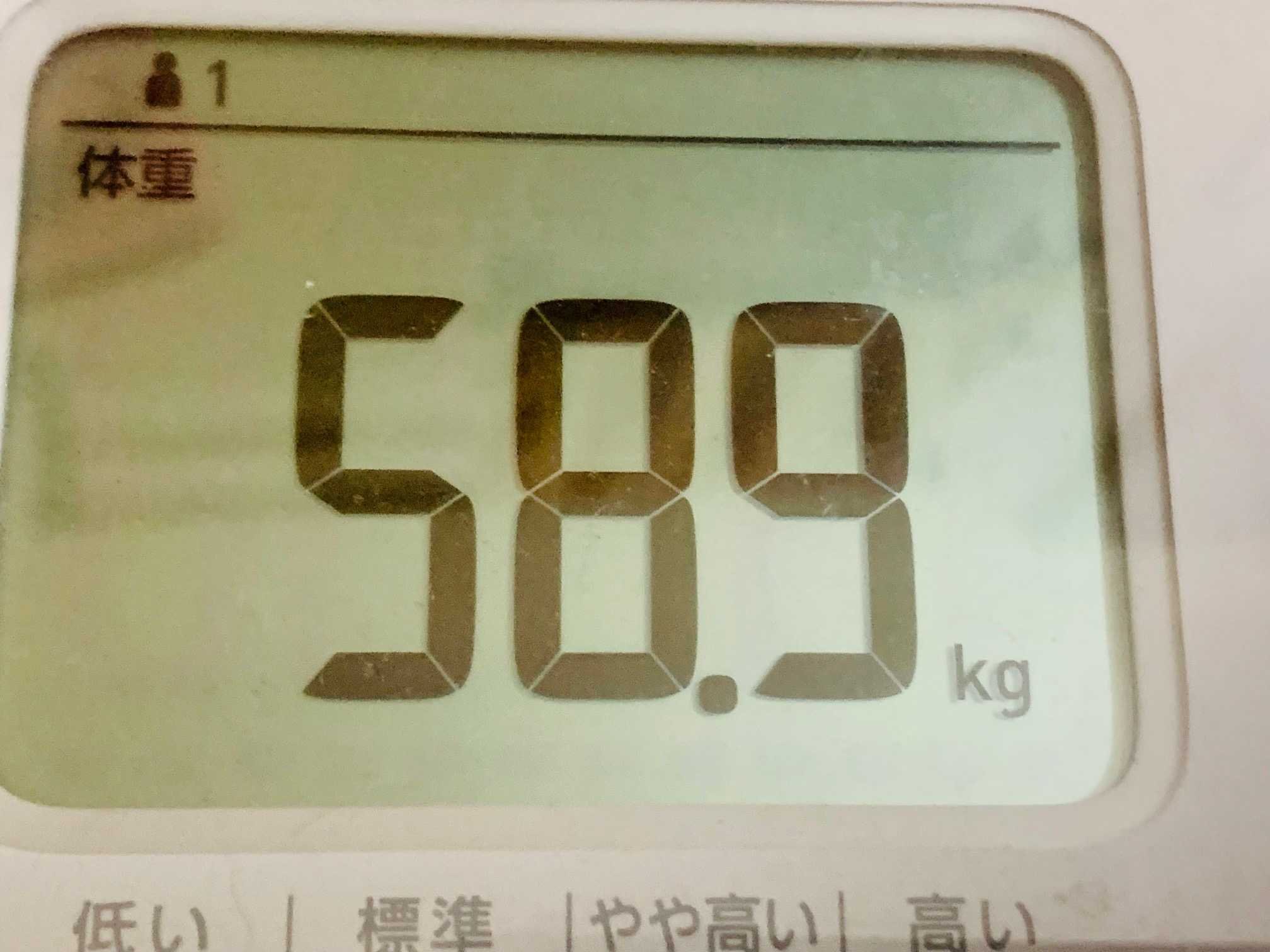 体重は、夕食後・入浴前58.9kg。2日前より0.7kg増えた、、、便秘中なので、、、