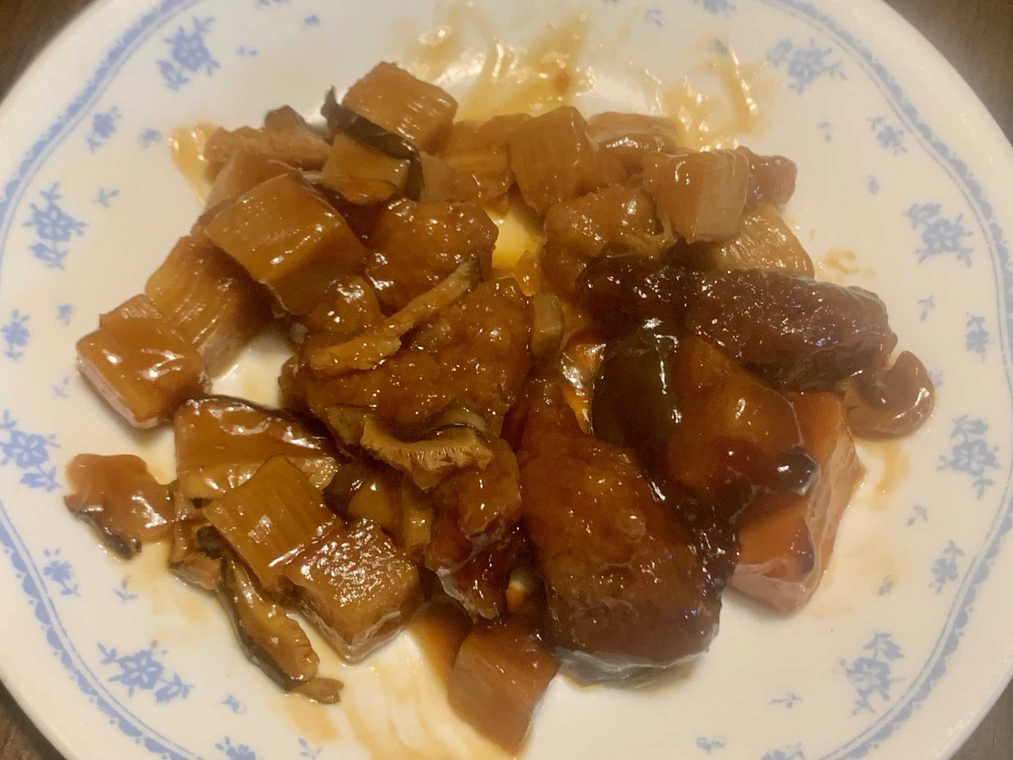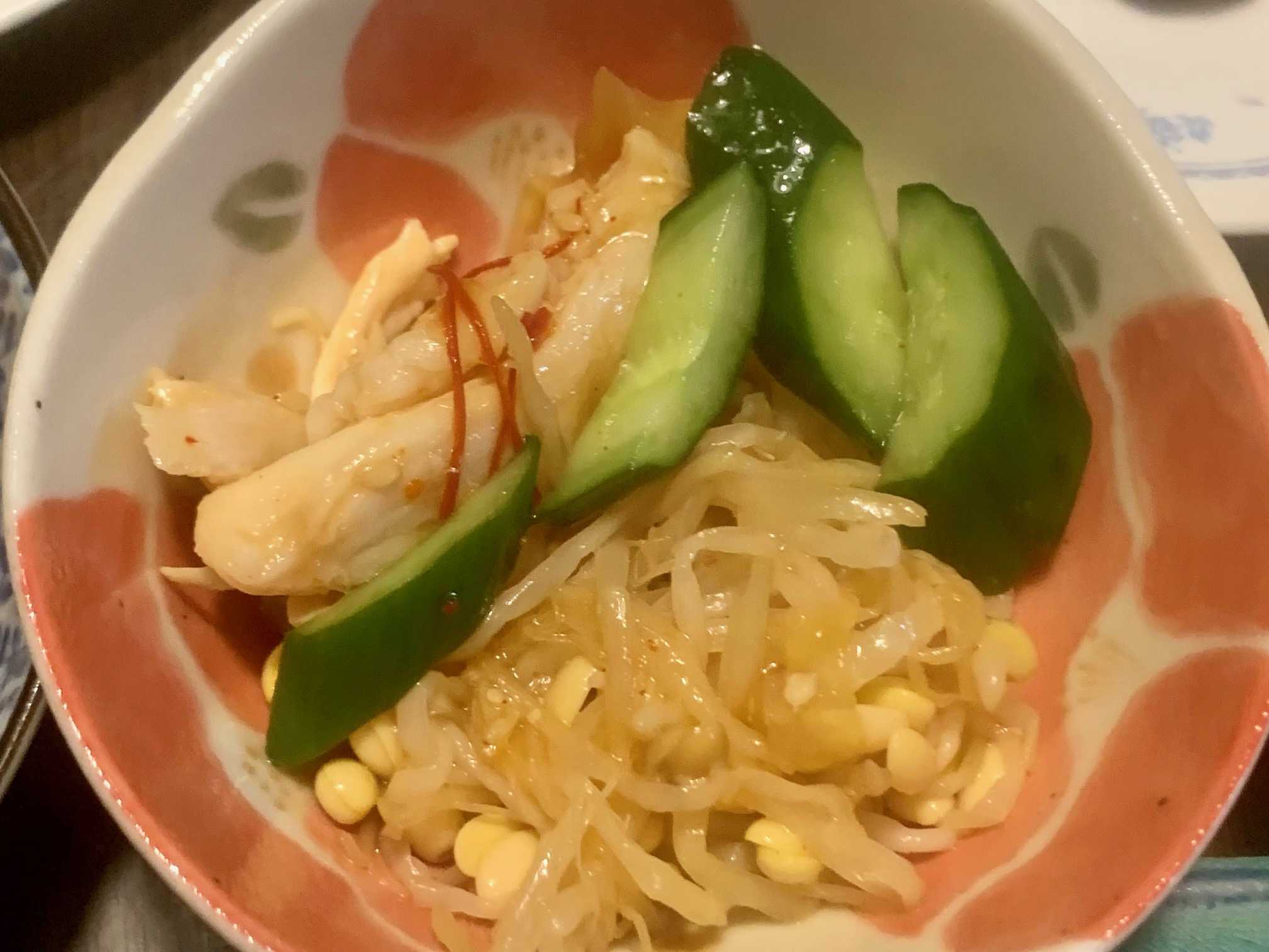 夕食は、酢豚、鶏・中華クラゲ・豆もやし・胡瓜・唐辛子、長芋の梅酢漬け、油揚げ・切り干し大根・人参煮、生牡蠣・ポン酢、小松菜のコンソメスープ、いちご・とちおとめ。