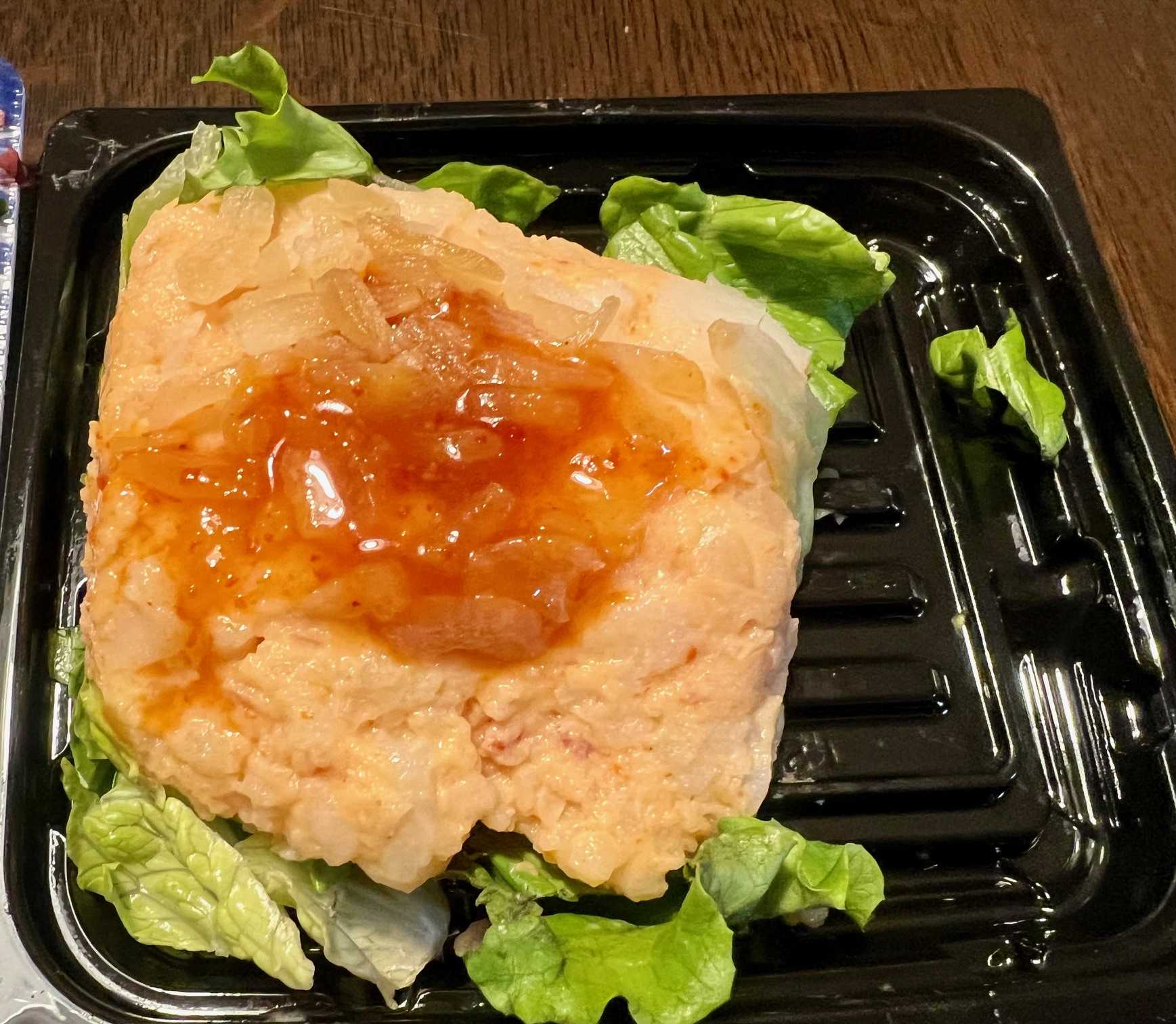 夕食は、炭火焼きつくね(軟骨入り)、つぶ貝刺身、辛うまレッドポテトサラダ、がんも・卵・玉こんにゃく・椎茸・筍・大根・人参・蓮根煮、小松菜の味噌汁、ミックスフルーツ(パイン、グレープフルーツ、オレンジ、キウイ、ぶどう)。