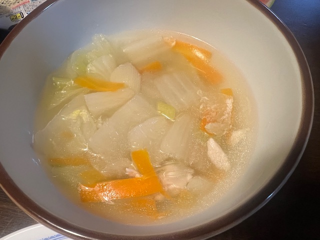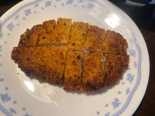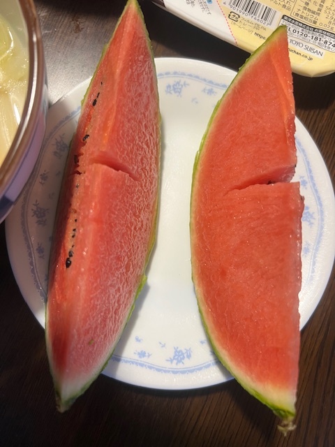夕食は、チーズカツレツ、鶏・白菜・玉ねぎ炒め、レタス・ミニトマト、蒸し茄子、玄米ご飯、鶏・春雨・白菜・人参・太葱の中華スープ、小玉西瓜。