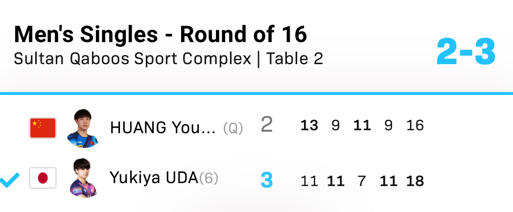 | 19:45 | 男子S-2回戦 | 宇田幸矢WR36 3-2 黄友政(中国)WR-![]() ![]() |